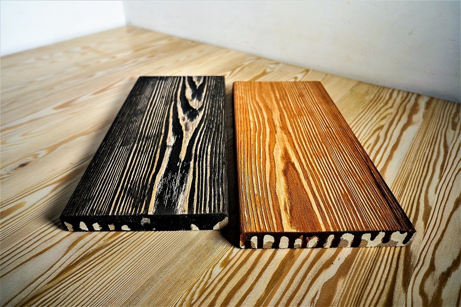 Для лиственницы идеально подходят лессирующие полупрозрачные схемы, а использование цветного праймера только усилит контрастность между слоями и особо выделит текстуру лиственницы.