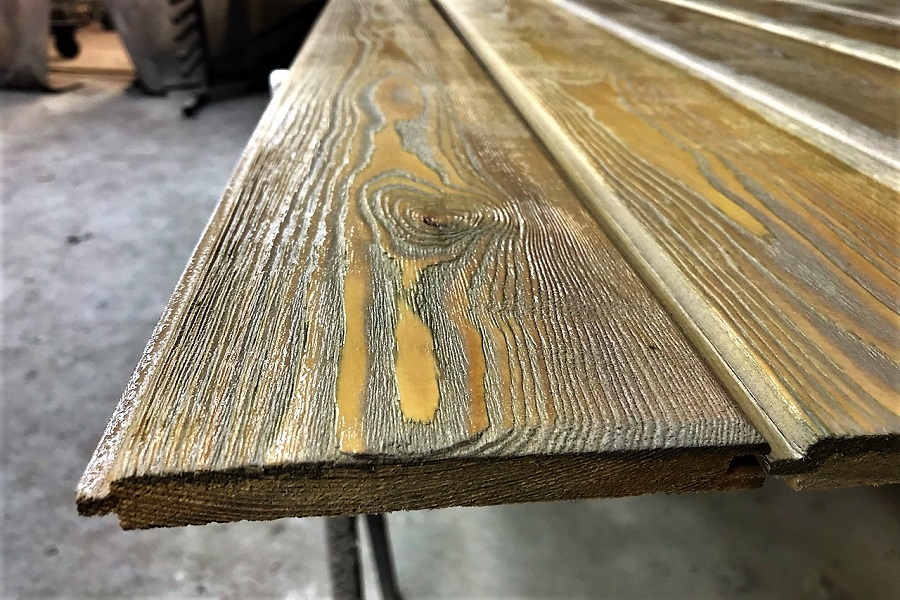 Чтобы подчеркнуть внешний облик искусственного старения необходимо жесткой щеткой из металлических щетинок удалить верхние мягкие слои древесины. Или воспользоваться шлифовальной машинкой с насадкой из крупного абразива, а также вход можно пустить наждачную бумагу с крупным зерном.