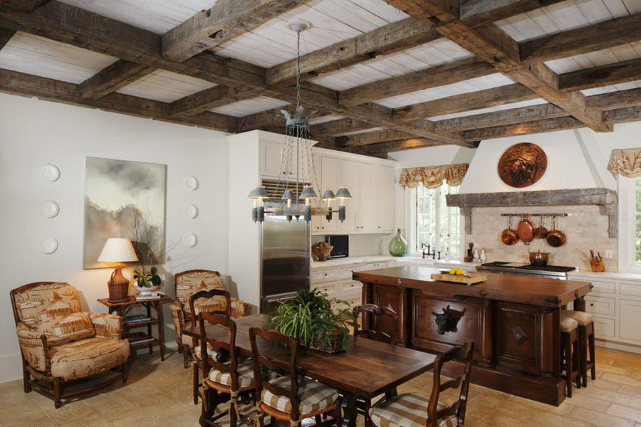 Например: отделка потолка фальшбалками на кухне потребует породы древесины, которые способны хорошо переносить влагу.