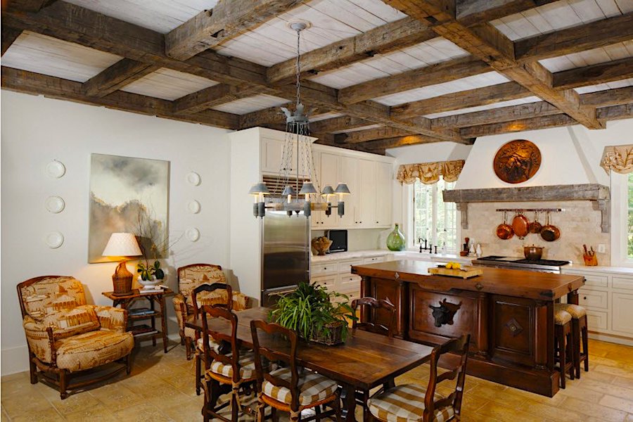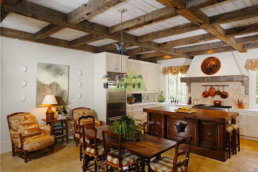В балки встраиваются светильники или они служат основанием для установки люстр. Для придания яркого контраста плоскостей и для разграничения функциональных зон, достаточно покрыть панели в светлые тона, а балки в более темные, вплоть до черных цветов.