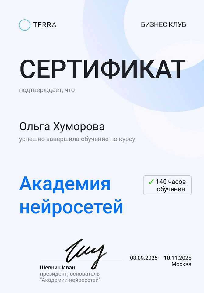 Учится, осваивает нейросети, острый, живой ум — она не только успевает за трендами, но и создаёт их. Говорят, нейросети обожают её за чувство юмора и идеально выверенные запросы. Она обожает природу, животных, особенно собак. Ее сердце болит за тех, кому сейчас плохо. Потому что Ольга Человек с большой буквы.