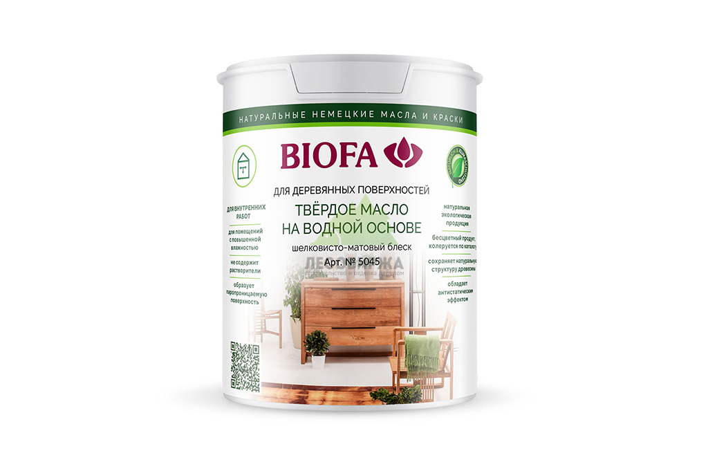 Твердое масло на водное основе шелковисто-матовое BIOFA 5045, выполненное из натуральных масел, смол и воска, предназначено для окрашивания пола, стен, мебели, предметов интерьера, изготовленных из древесины твердых и мягких пород. Используется только для внутренних работ! Во время нанесение рекомендуется обеспечить доступ свежего воздуха.