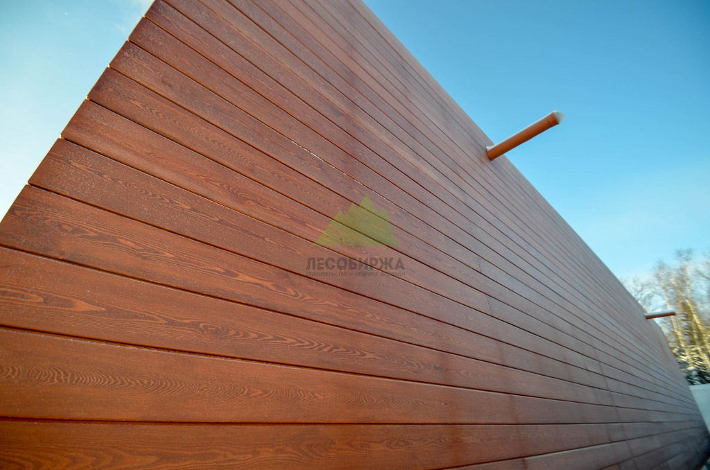 Планкен из лиственницы скошенный сорт ЭКСТРА 140x20x4000 устанавливают на заранее подготовленную обрешетку из деревянных брусьев. Чтобы зафиксировать панели на обрешетке, понадобится крепеж типа «Змейка» или «Конструктор». Это небольшие металлические пластины, которые имеют готовую перфорацию для крепления на саморезы. После завершения работ крепеж не виден на поверхности. К тому же не повреждается целостность досок. И осуществить демонтаж при необходимости тоже легко.