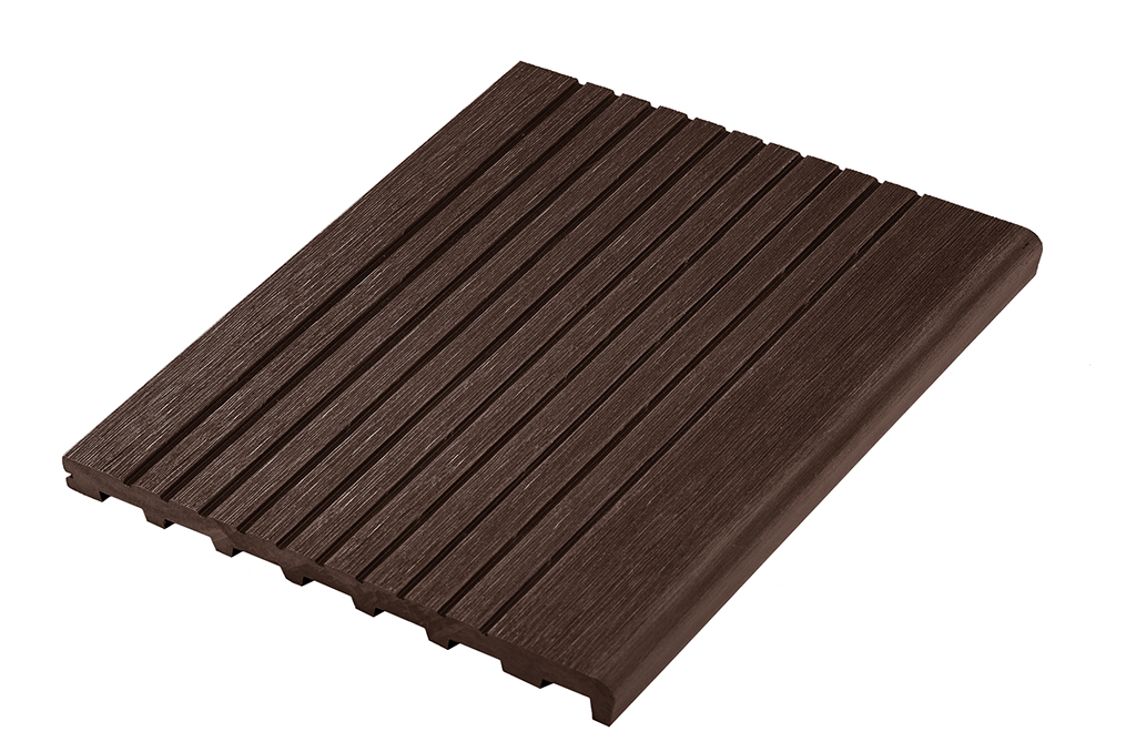 Ширина 345 мм позволяет перекрыть край настила одной деталью без узких доборов и «лесенки» из вставок. Толщина 23 мм даёт запас жёсткости в проходных зонах, длина 3000 мм сокращает количество стыков и ускоряет монтаж. Композит не впитывает влагу, не растрескивается и не требует покраски — обслуживание сводится к сезонной мойке.