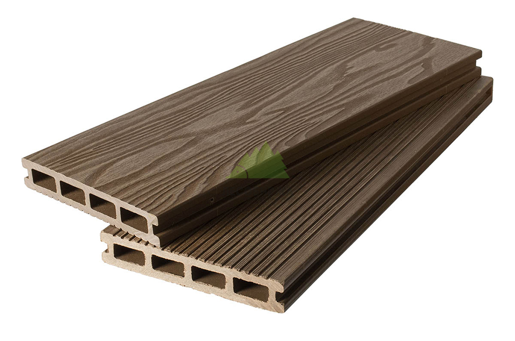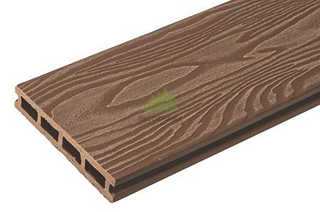 Террасная доска из ДПК TalverWood вельвет/3D 150х25х4000, орех — двусторонняя планка с двумя рабочими поверхностями. Сторона «вельвет» даёт цепкое сцепление за счёт тонкой продольной насечки, а сторона «3D» имитирует древесную фактуру с выразительным рельефом. Тёплый ореховый цвет добавляет настилу глубины и легко сочетается с камнем, бетоном и зелёными насаждениями.