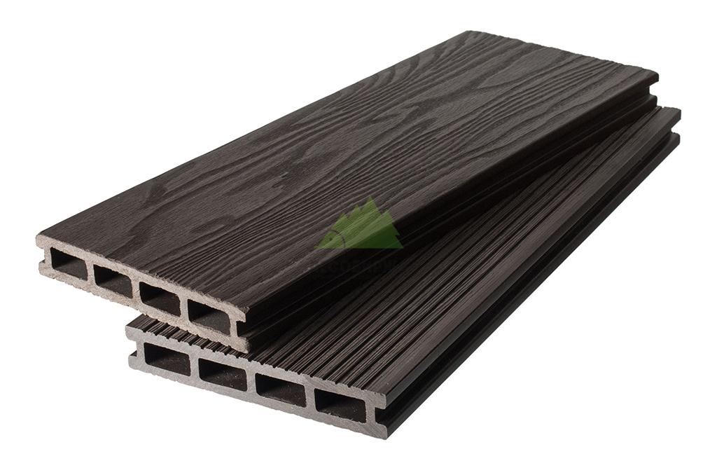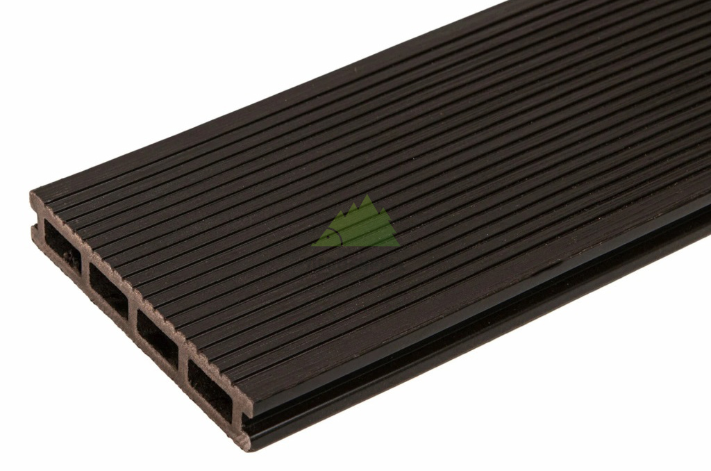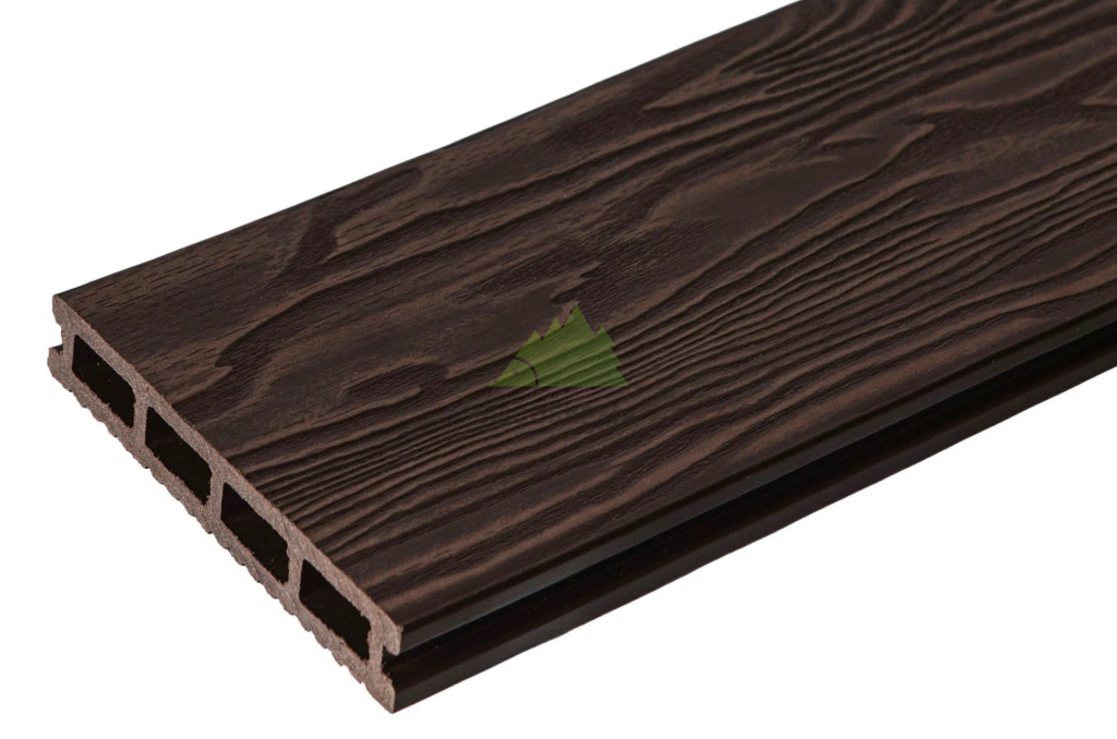 Террасная доска из ДПК TalverWood вельвет/3D 150х25х4000, венге — двусторонняя планка для террас, подиумов и крылец. Сторона «вельвет» с тонким продольным рифлением отвечает за цепкий шаг, сторона «3D» повторяет древесную текстуру с выраженным объёмным тиснением. Глубокий оттенок венге добавляет настилу солидности и подчёркивает геометрию раскладки.
