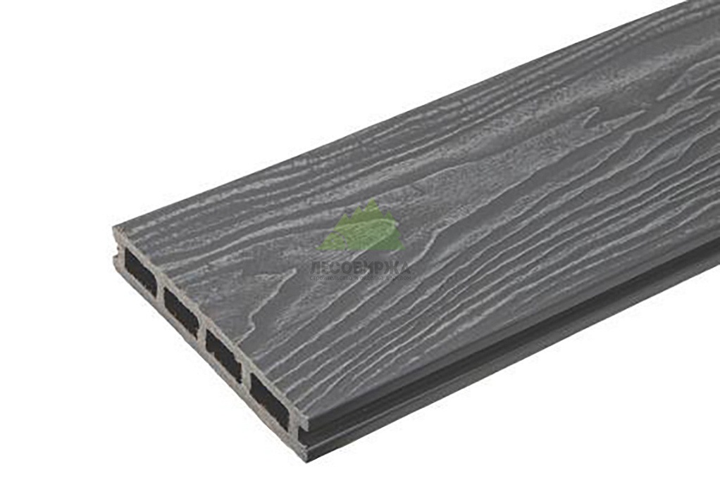 Террасная доска из ДПК TalverWood вельвет/3D 150х25х6000, серый — двусторонняя планка с рабочими поверхностями «вельвет» и «3D». Микроребристый «вельвет» даёт уверенное сцепление во влажную погоду, а рельефная сторона «3D» имитирует древесную текстуру с глубокой игрой света и тени. Нейтральный серый оттенок подчёркивает архитектурные линии и гармонирует с бетоном, металлом и стеклом.