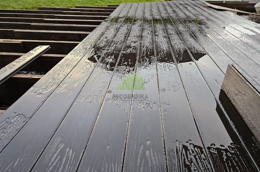 Террасная доска из МПК шлиф./вельвет 140х22х6000, графит — реверсивная планка с двумя рабочими поверхностями. С одной стороны — аккуратная шлифованная текстура с мягким тактильным ощущением, с другой — «вельвет» с тонким рифлением для цепкого шага. Холодный графит подчеркивает строгую геометрию настила и органично сочетается с бетоном, металлом и стеклом.