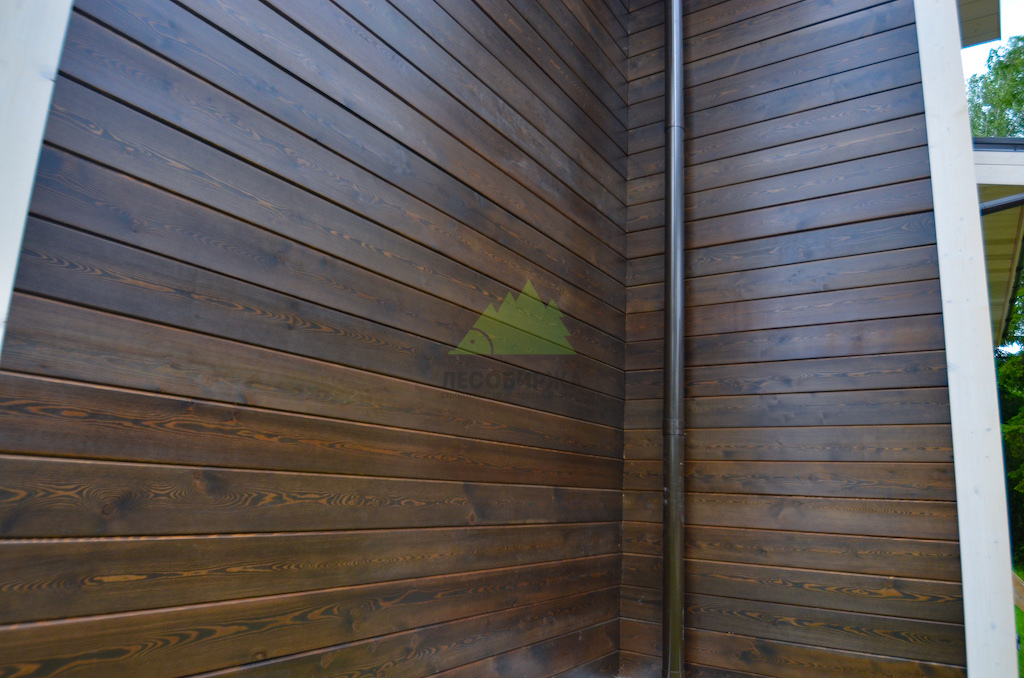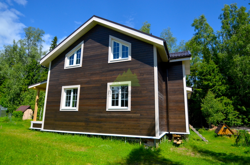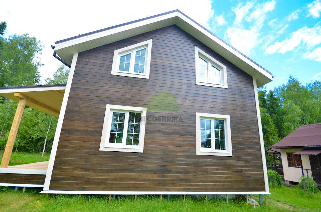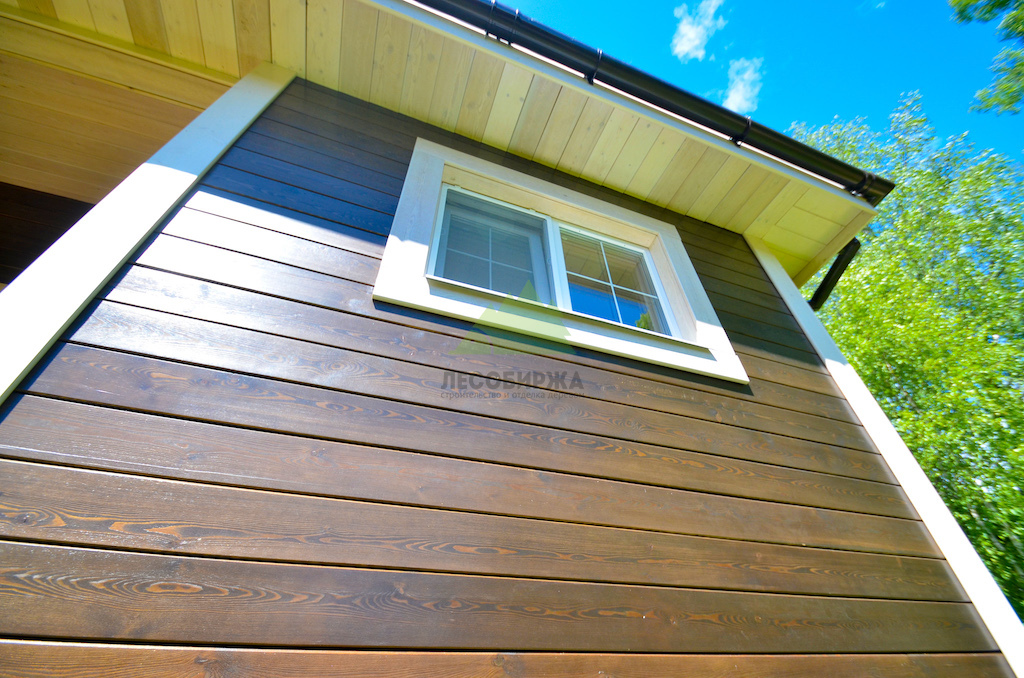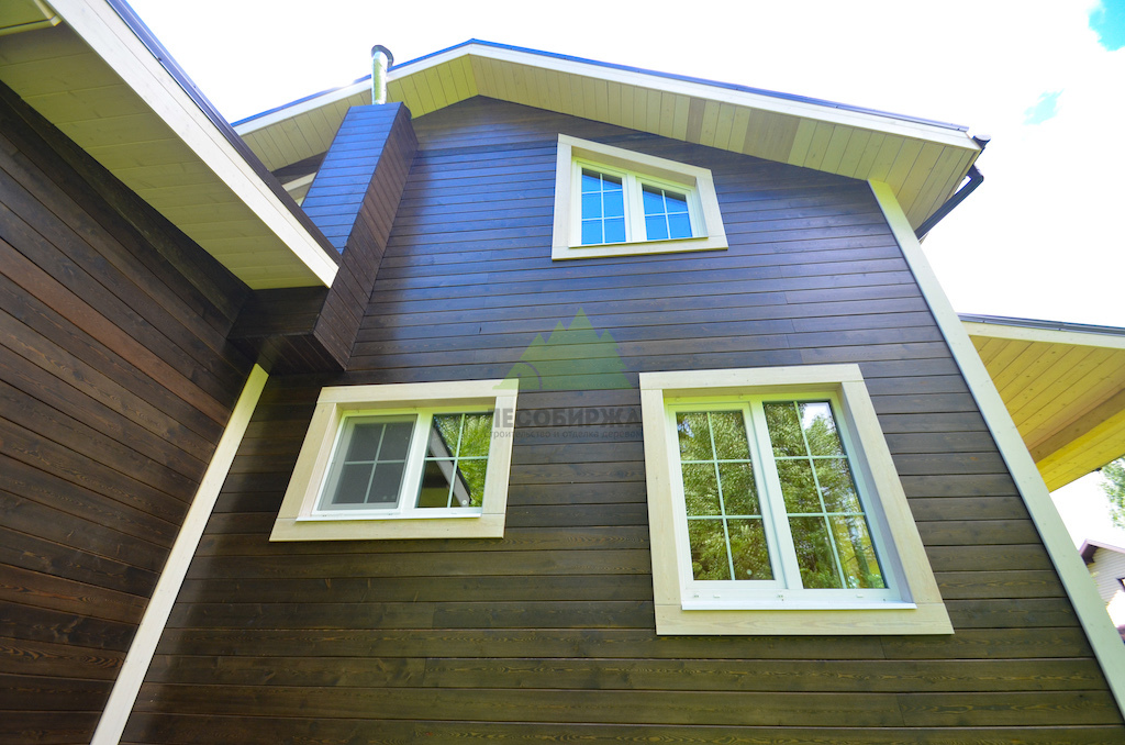 Особую изюминку проекту придало интересное сочетание темного, полупрозрачного оттенка фасада с белым, укрывистым цветом накладок на углы и наличников на окнах. Этот контраст не только визуально выделяет архитектурные элементы дома, но и придает ему элегантность и современность. Наши клиенты, выбирая эти решения, продемонстрировали тонкий вкус. Здесь важно отметить, что при использовании укрывной краски в белых тонах, особенно для элементов, находящихся в прямом контакте с основной облицовкой и подверженных воздействию влаги, крайне важно выбирать древесину высоких сортов — "ЭКСТРА" или "ПРИМА" — с минимальным количеством сучков или их полным отсутствием. Это объясняется тем, что скипидар, содержащийся в смоле древесины низших сортов, может со временем проступить на поверхности белой краски в виде неэстетичных желтых пятен, что испортит весь внешний вид и потребует дорогостоящего перекрашивания. Благодаря грамотному выбору материалов, глубоким знаниям о свойствах древесины и безупречной подготовке в цехе Лесобиржи-Спб, эти элементы будут радовать владельцев дома своей чистотой и свежестью долгие годы, подтверждая нашу приверженность качеству и долговечности.