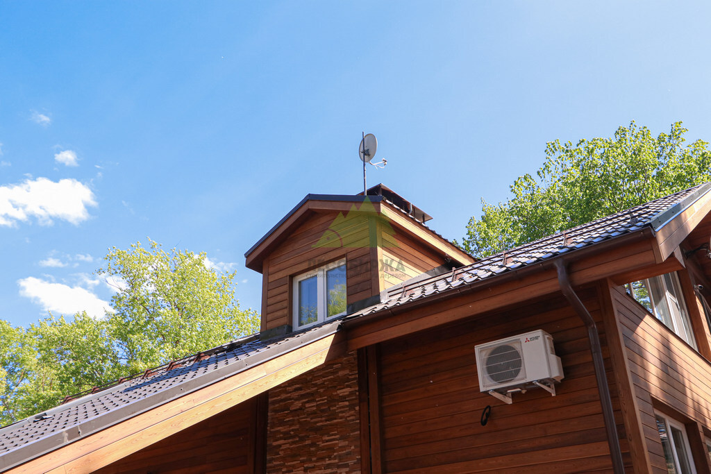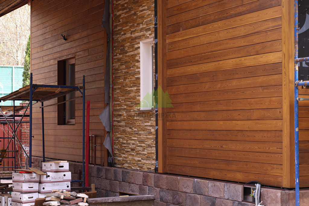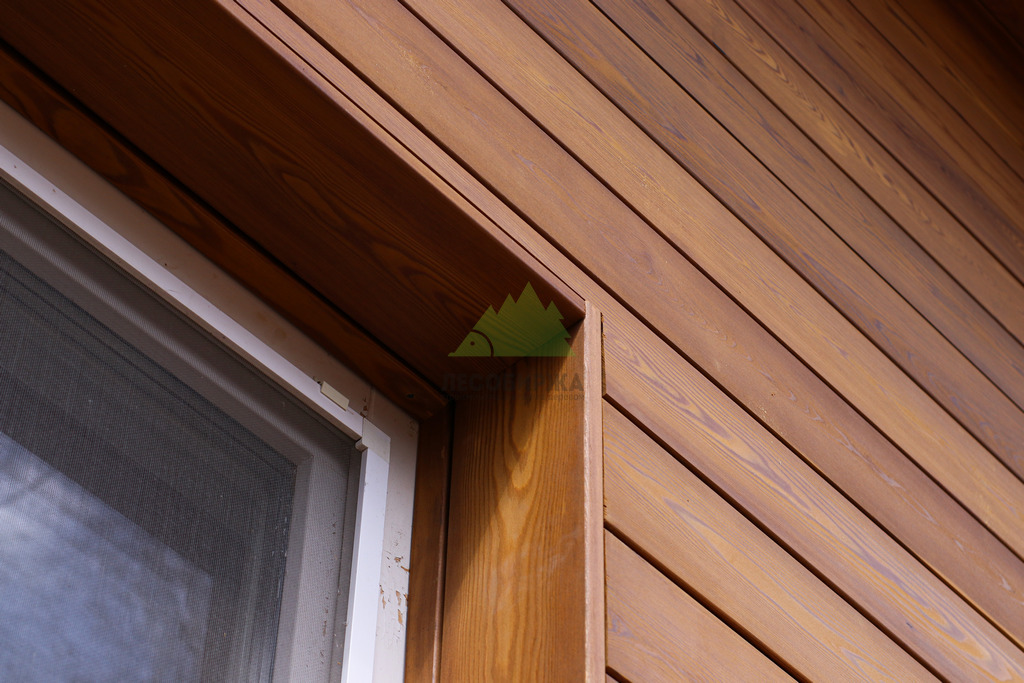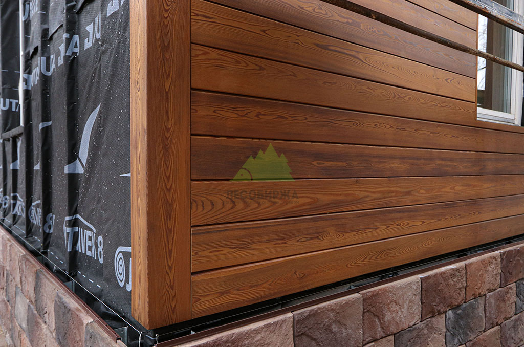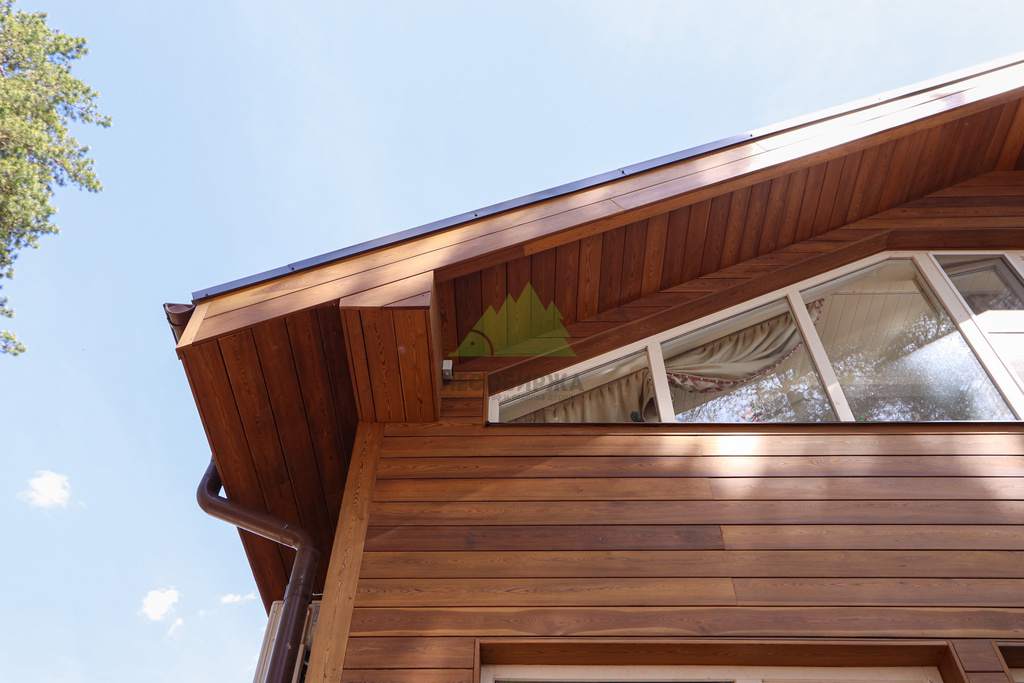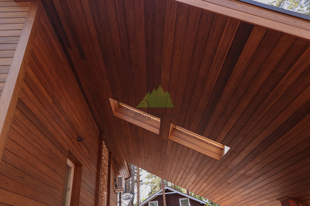 Монтаж планкена из термолиственницы был выполнен по технологии скрытого крепежа. Это не только обеспечивает идеально ровную и эстетически привлекательную поверхность без видимых элементов крепежа, но и защищает древесину от дополнительных точек проникновения влаги. Каждый элемент планкена был установлен с филигранной точностью, обеспечивая идеальные стыки и углы. Особое внимание уделялось обработке торцов и мест примыкания к оконным и дверным проемам, где были использованы специальные элементы и герметики для обеспечения максимальной герметичности и защиты от атмосферных осадков.