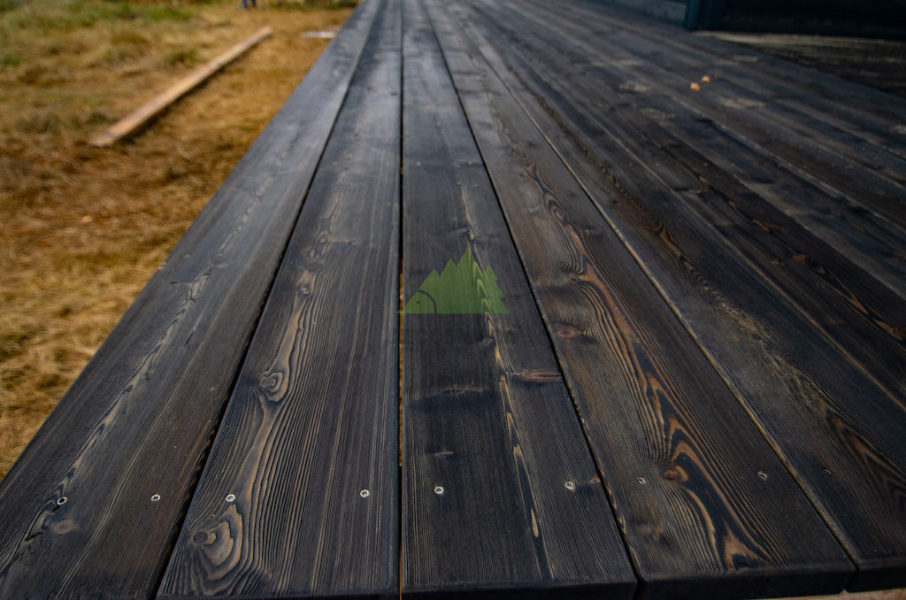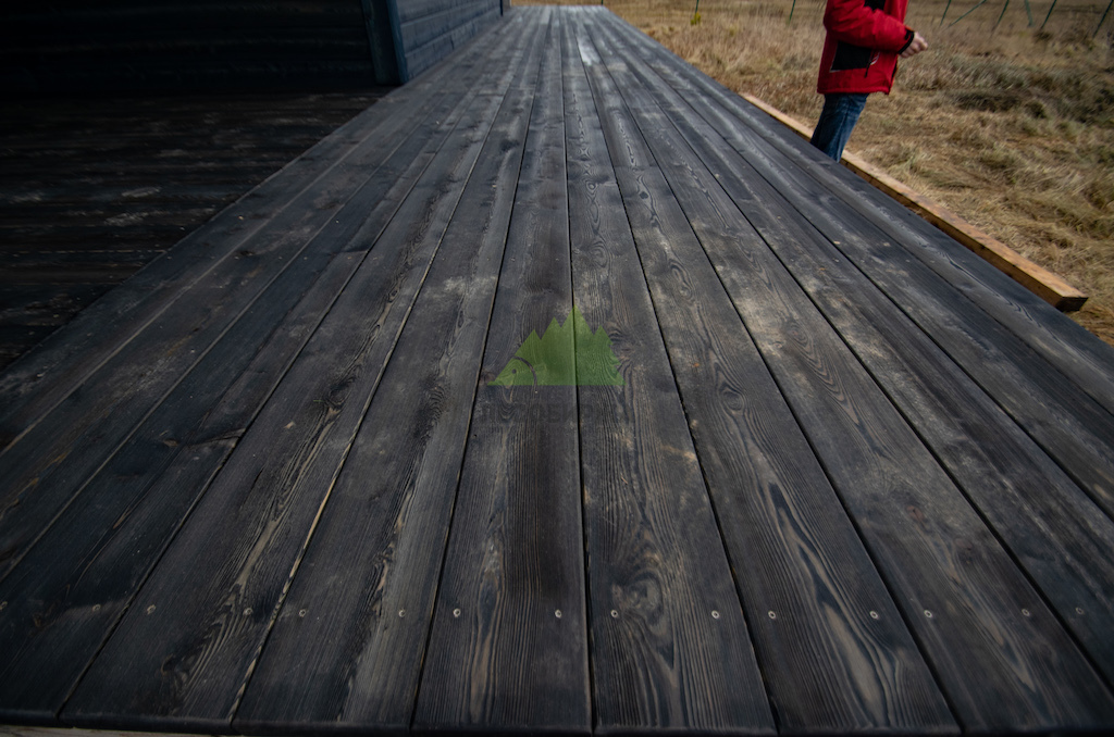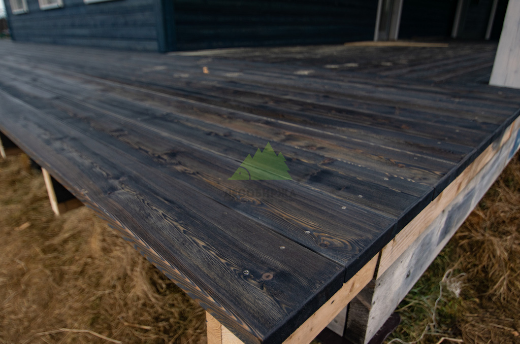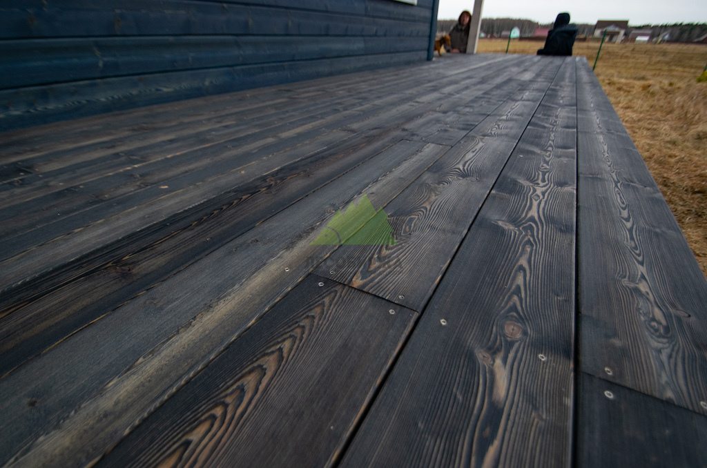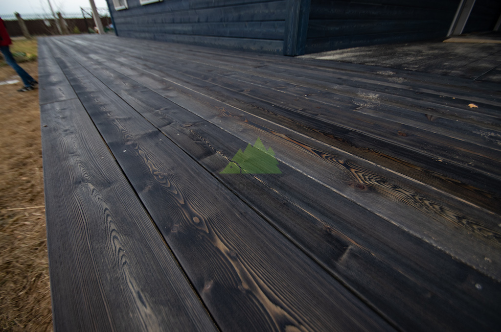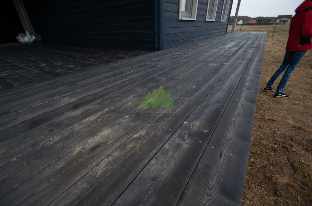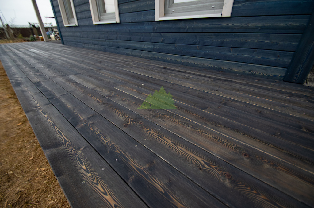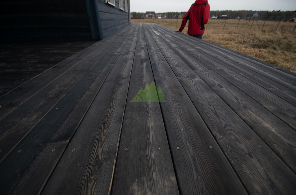 Когда работы по фасаду были завершены, и семья приехала оценить результат в Ромашкинских усадьбах, их восторг был лучшей наградой для нашей команды. Особенно эмоционально отреагировала хозяйка, не скрывая своего восхищения преобразившимся домом. Сдержанное, но крепкое мужское рукопожатие главы семьи говорило красноречивее любых слов. Удовлетворение было настолько велико, что прямо на объекте поступил новый заказ! Клиенты захотели, чтобы их терраса также приобрела благородный вид состаренной древесины. Мы с радостью взялись за работу, ведь для нас нет лучшего показателя качества, чем доверие и повторные обращения. Для террасы была выбрана брашированная террасная доска из лиственницы сорта ВС размером 140х28 мм. Весь процесс брашировки и нанесения финишного покрытия – гидромасла Renner YS M300 (цвет TV-43+150гр), идеально подобранного под уже выполненный фасад, – также проходил в стенах нашей мастерской. Наши специалисты вновь продемонстрировали своё мастерство, попав точно в "яблочко" с выбором оттенка и степенью брашировки. Результат превзошел все ожидания, создав гармоничный и завершенный ансамбль дома и прилегающей террасы.