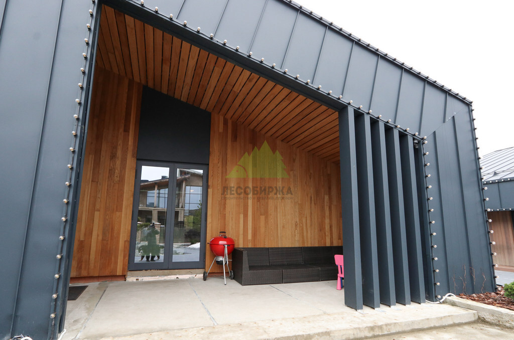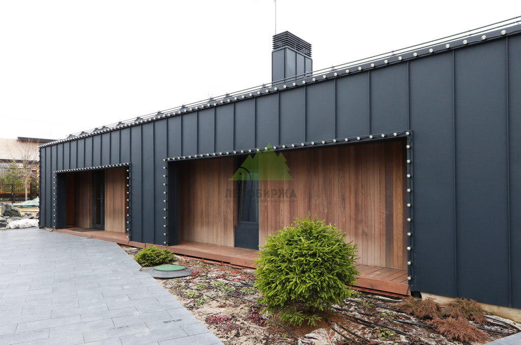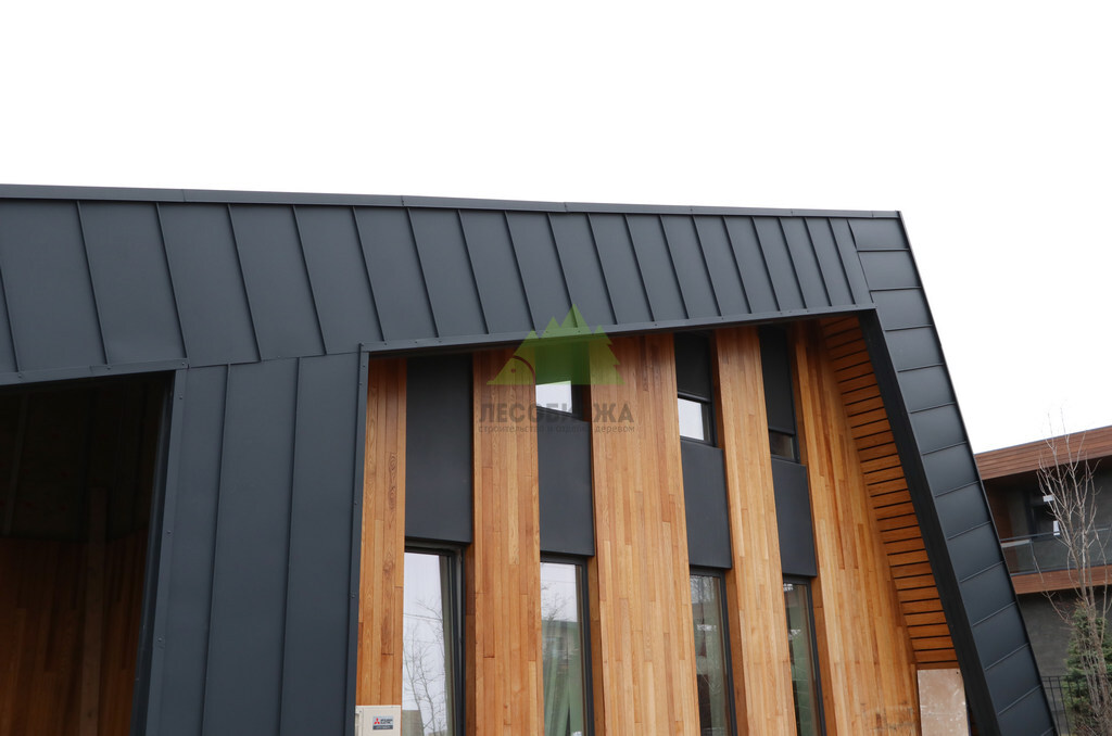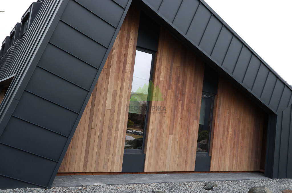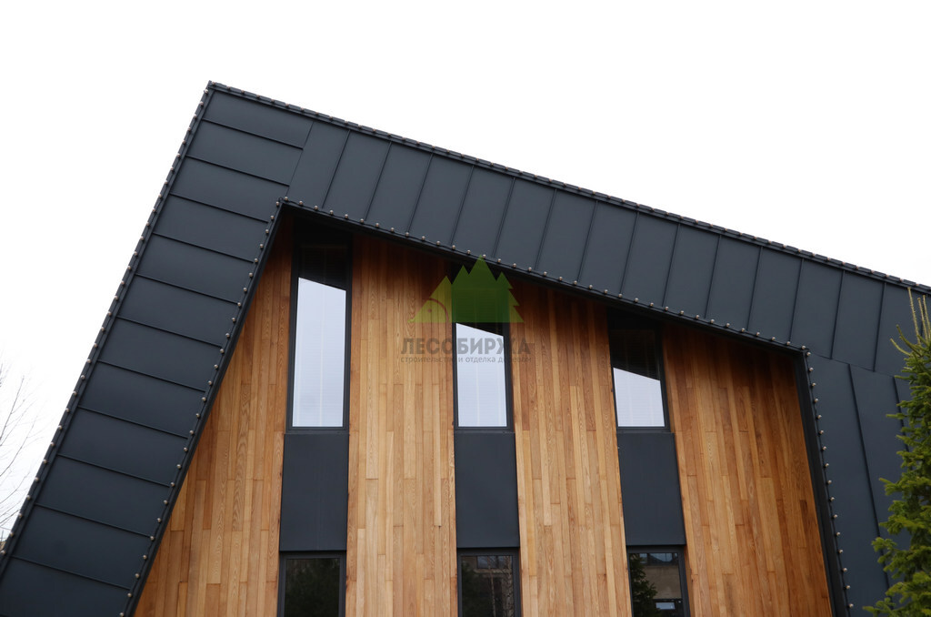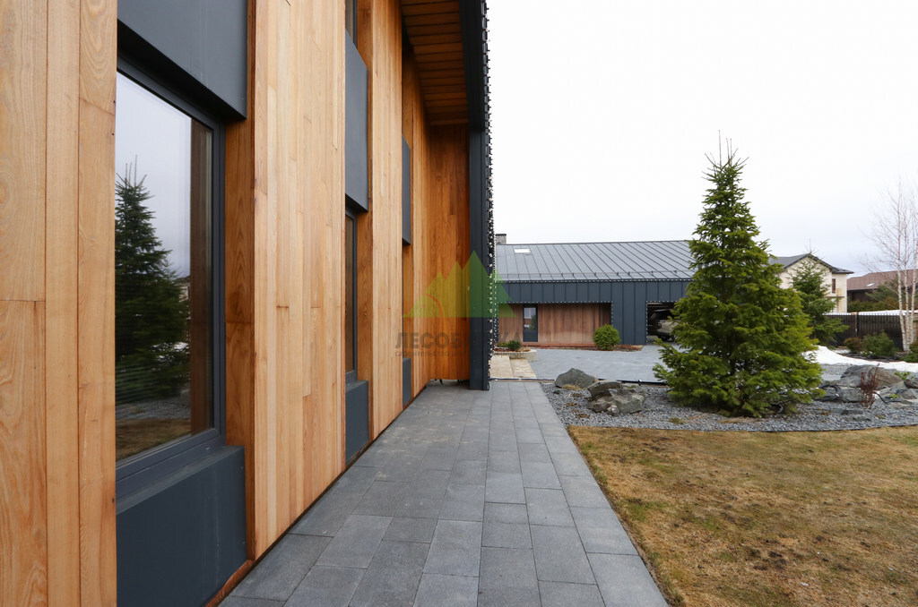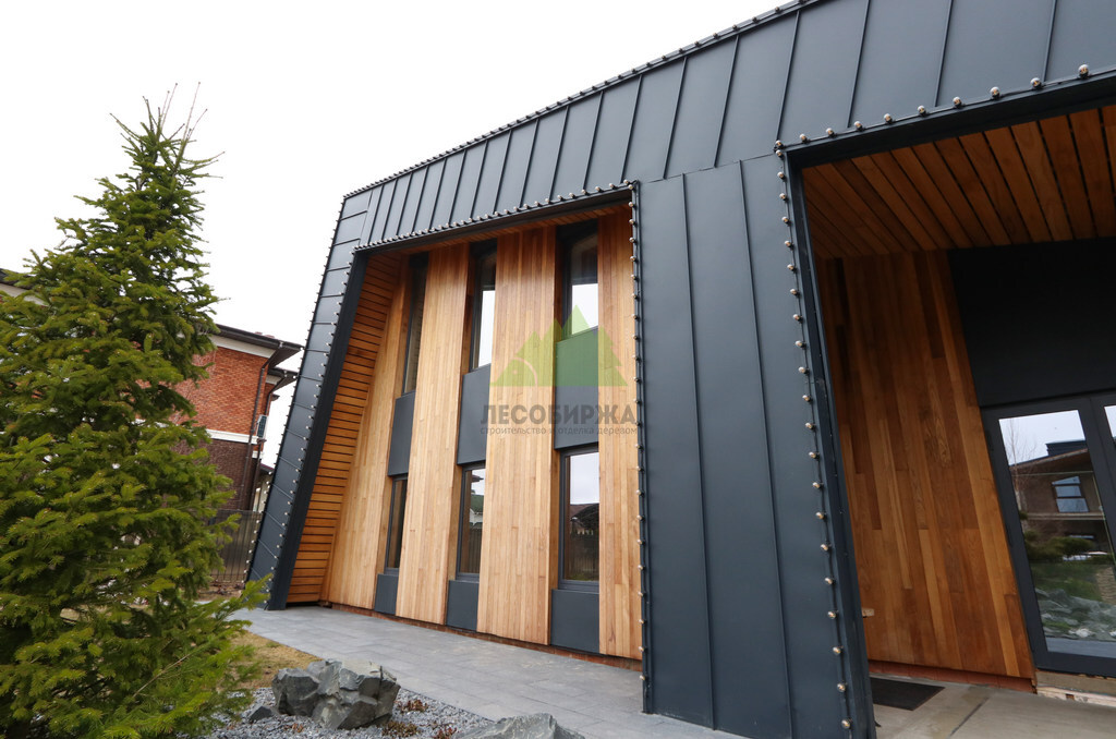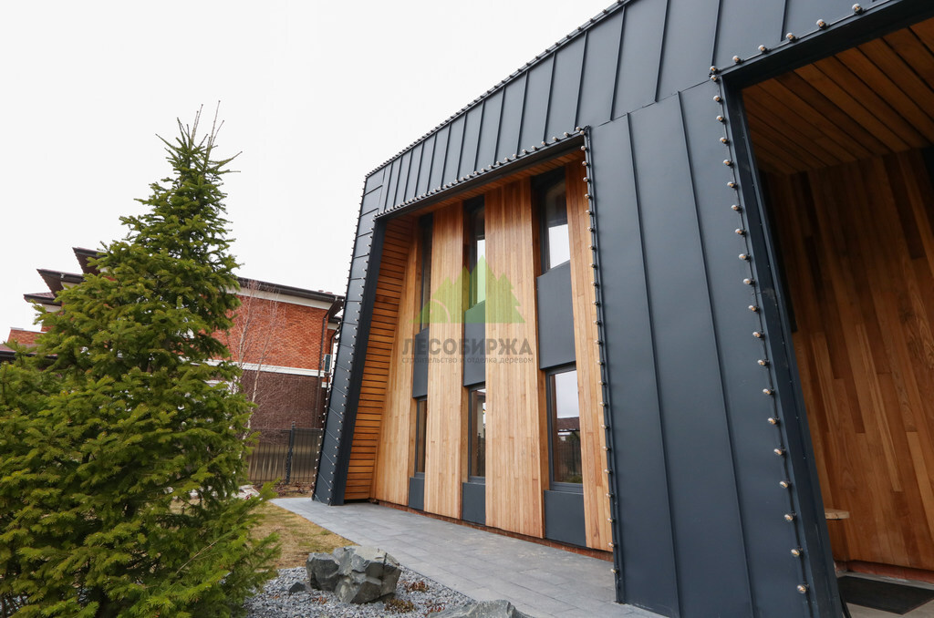 Основой для внешней отделки стали прямой планкен из термоясеня и фальцевые листы. Выбор термоясеня был продиктован его выдающимися эксплуатационными характеристиками и неповторимой текстурой. Планкен монтировался вертикально, "вразбежку", с использованием панелей различной длины и ширины, что добавило фасаду динамичности и оригинальности. Этот подход позволил создать нетривиальный рисунок, уходящий от стандартных решений и подчеркивающий индивидуальность дома.