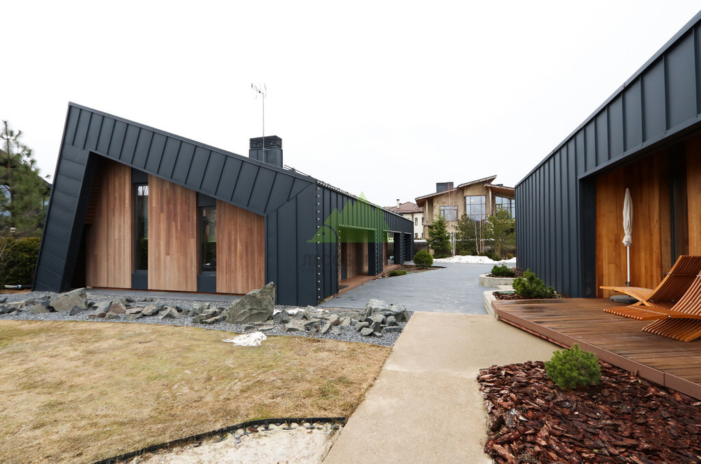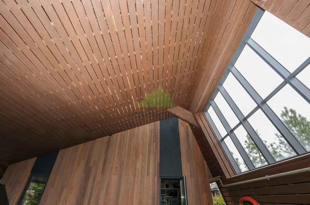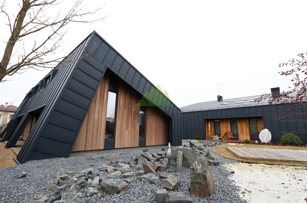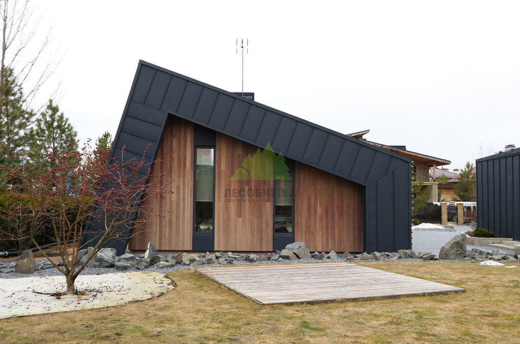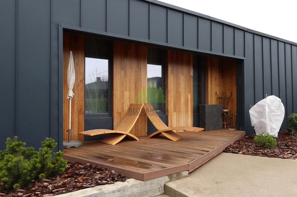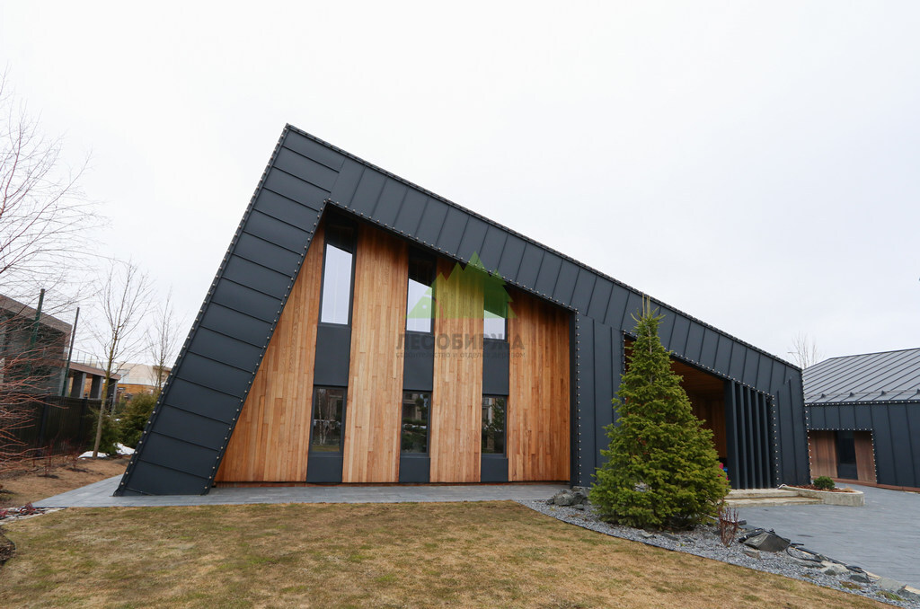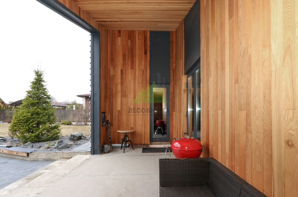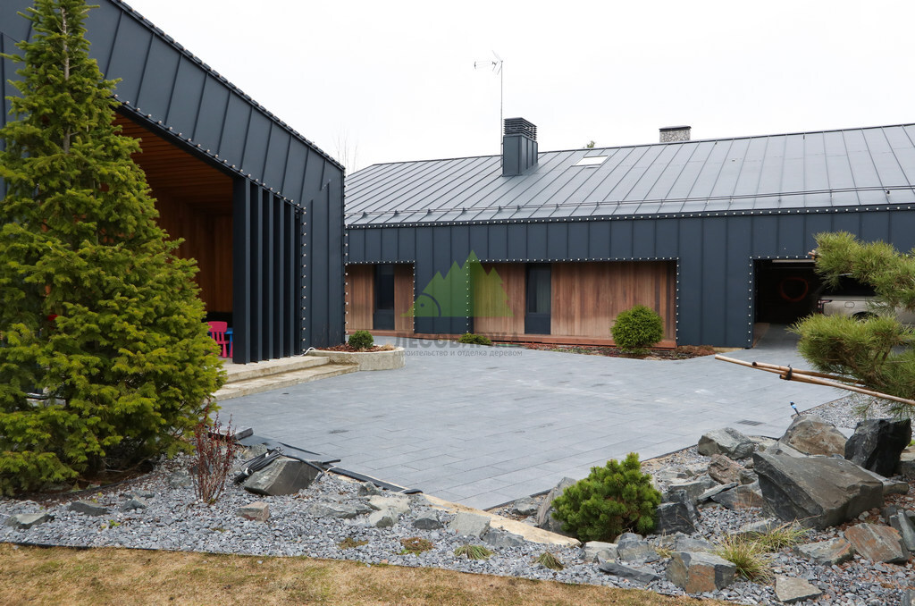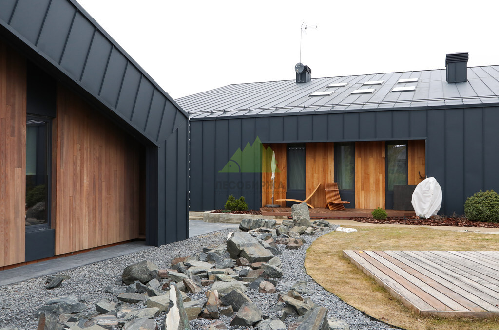 Основой для внешней отделки стали прямой планкен из термоясеня и фальцевые листы. Выбор термоясеня был продиктован его выдающимися эксплуатационными характеристиками и неповторимой текстурой. Планкен монтировался вертикально, "вразбежку", с использованием панелей различной длины и ширины, что добавило фасаду динамичности и оригинальности. Этот подход позволил создать нетривиальный рисунок, уходящий от стандартных решений и подчеркивающий индивидуальность дома.