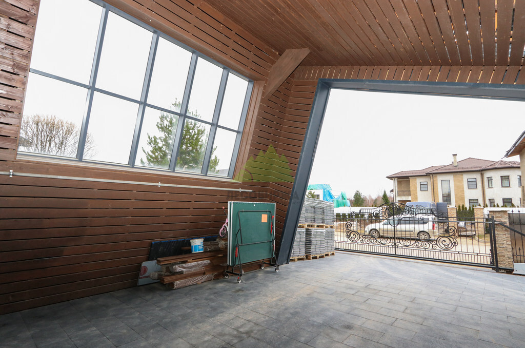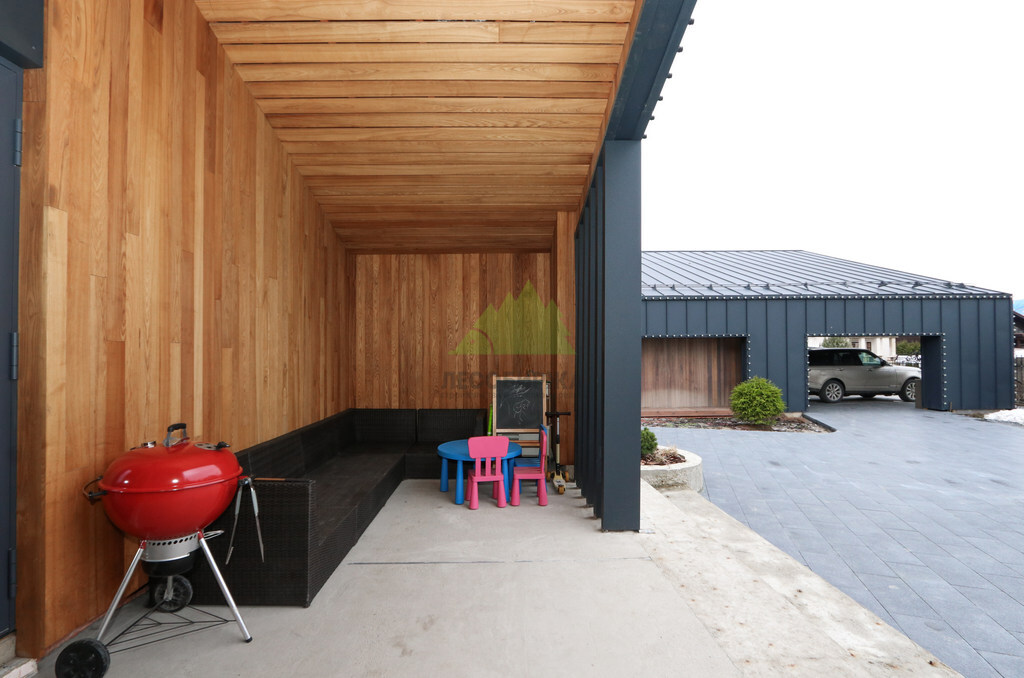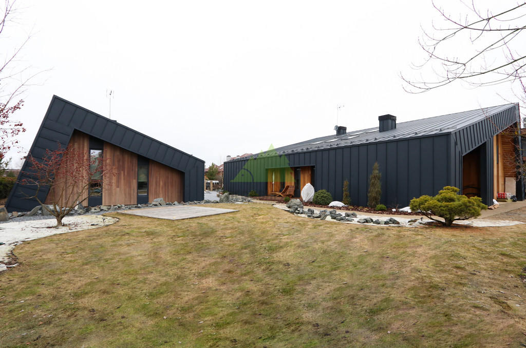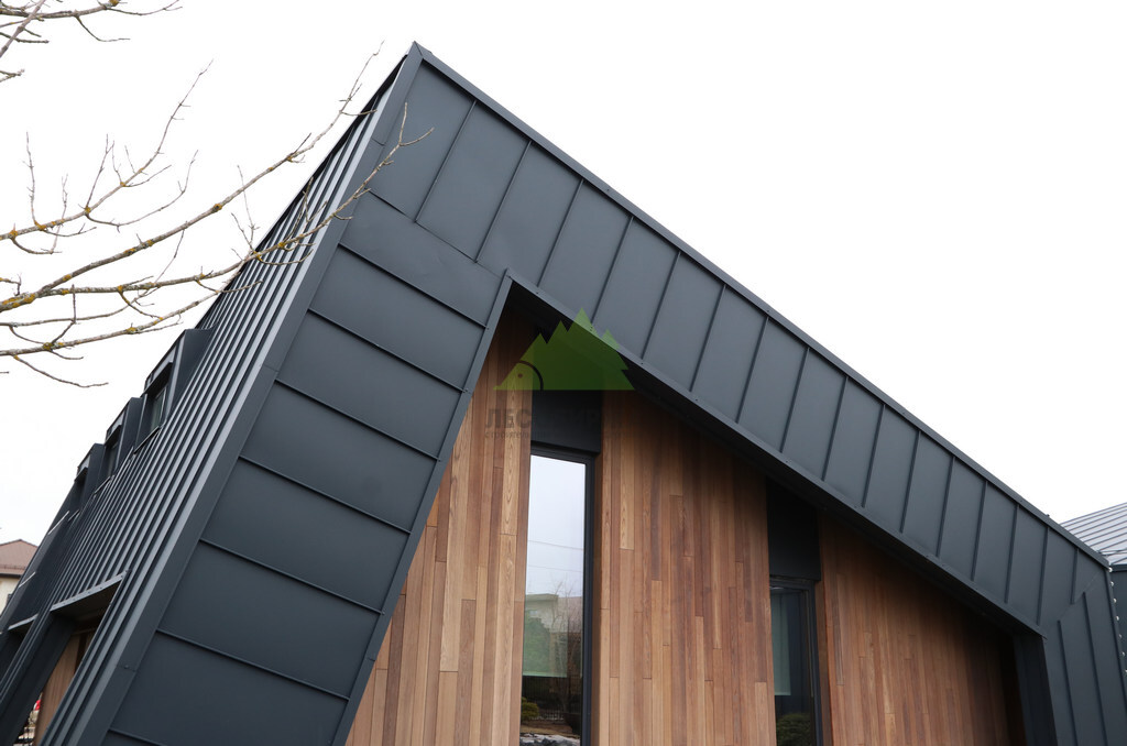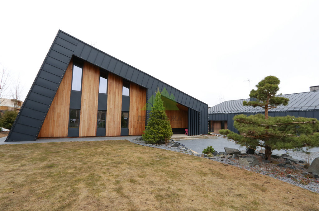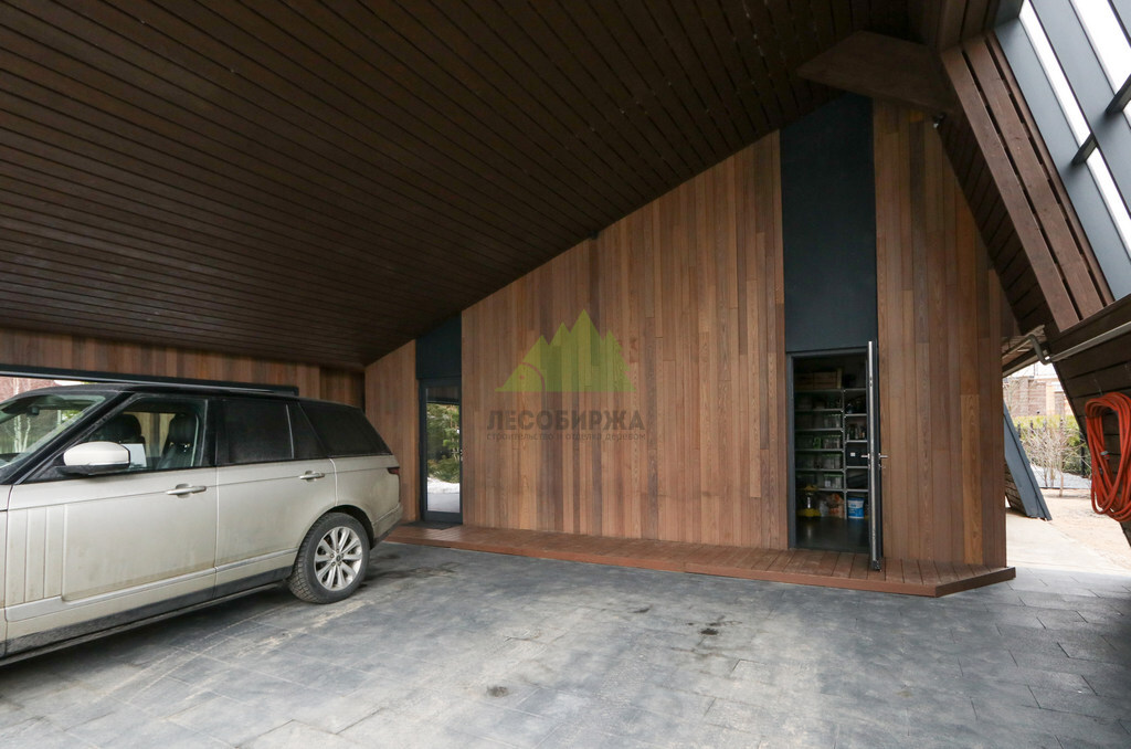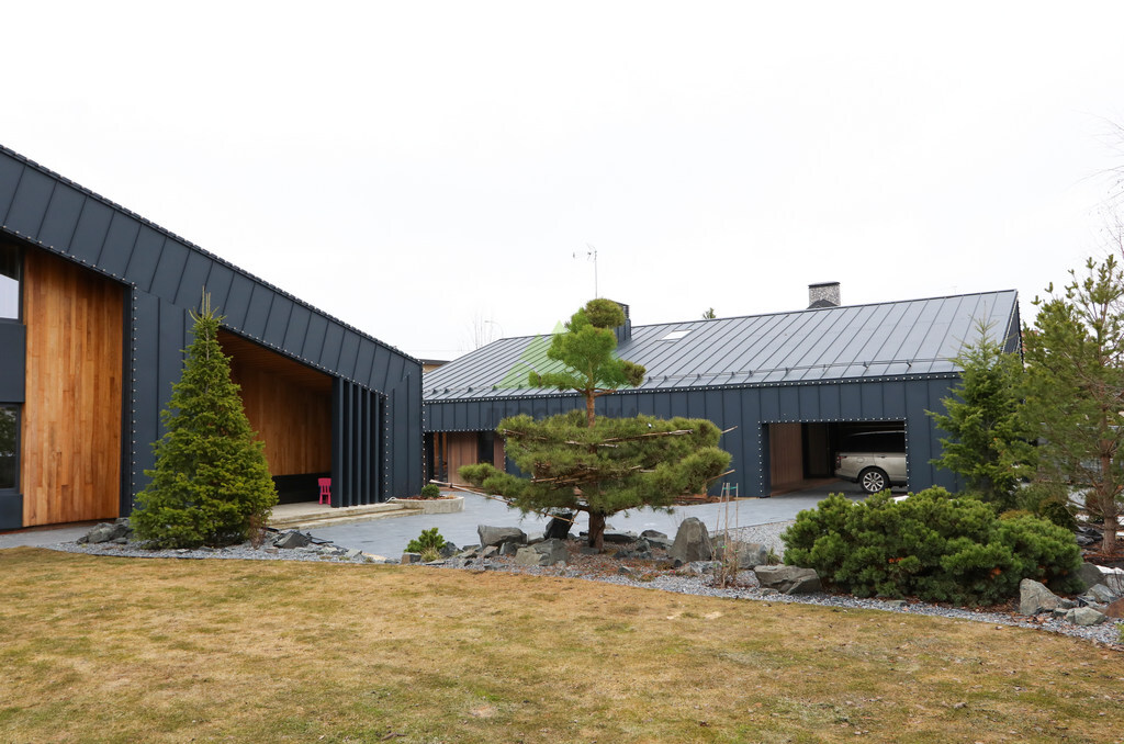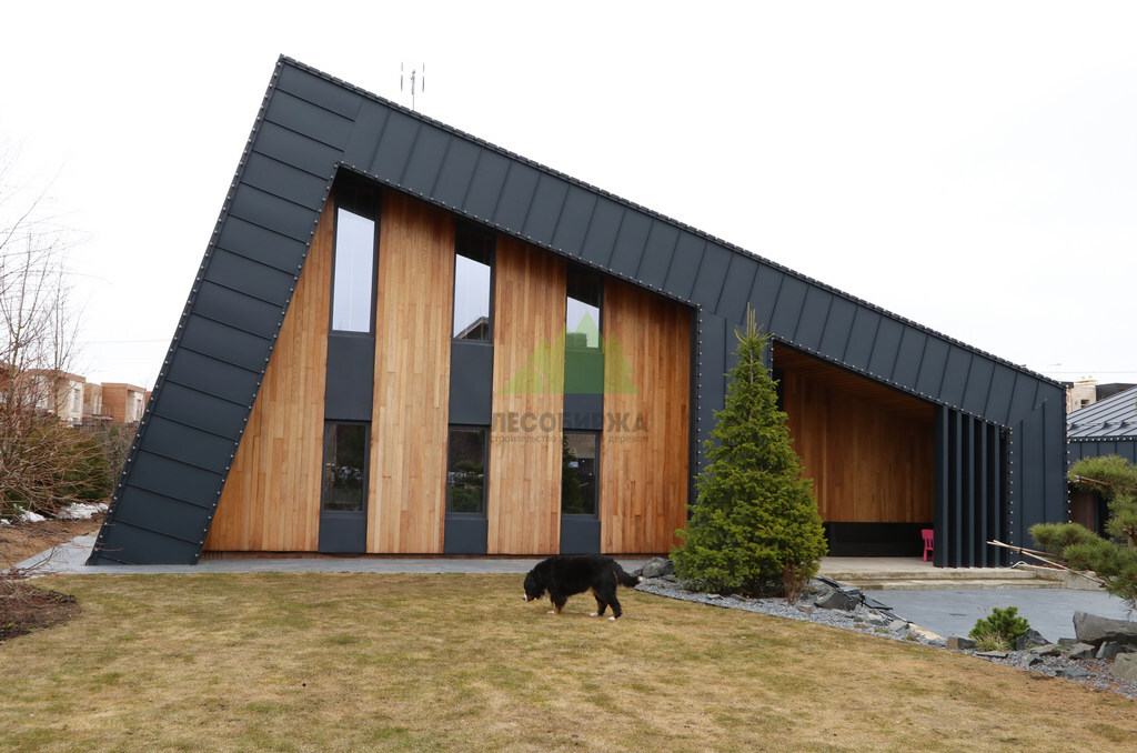 Основой для внешней отделки стали прямой планкен из термоясеня и фальцевые листы. Выбор термоясеня был продиктован его выдающимися эксплуатационными характеристиками и неповторимой текстурой. Планкен монтировался вертикально, "вразбежку", с использованием панелей различной длины и ширины, что добавило фасаду динамичности и оригинальности. Этот подход позволил создать нетривиальный рисунок, уходящий от стандартных решений и подчеркивающий индивидуальность дома.