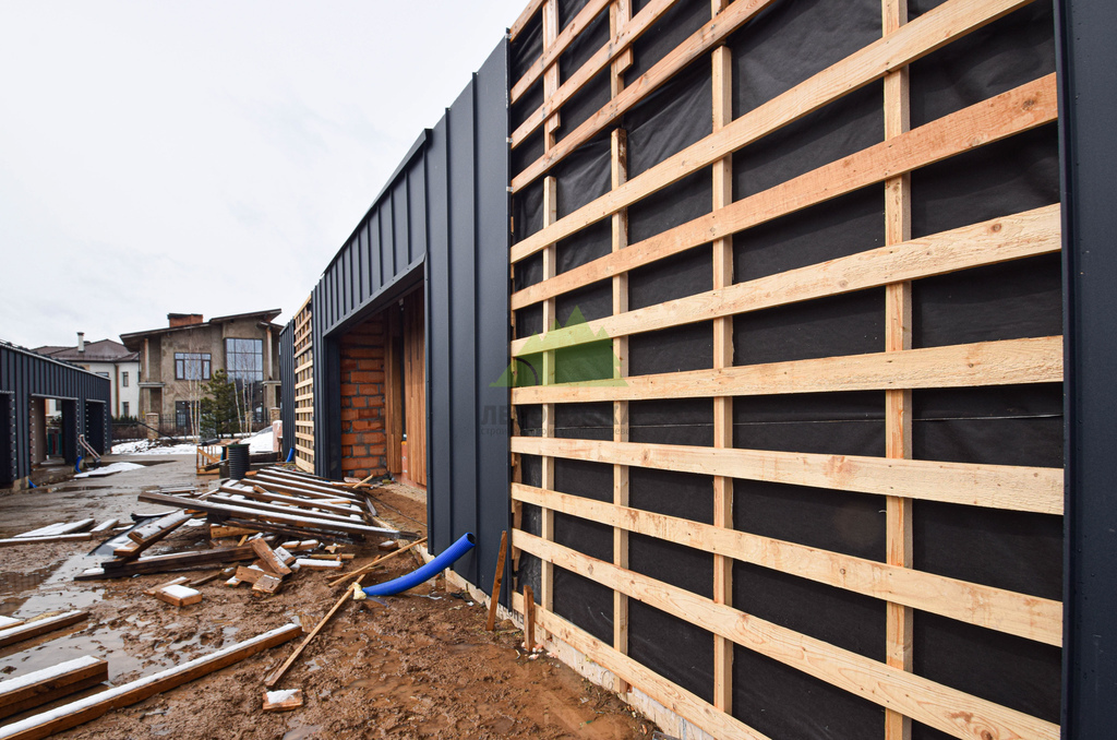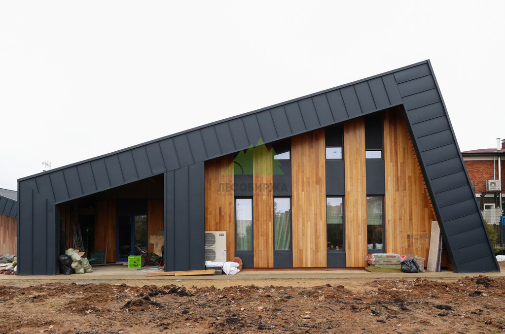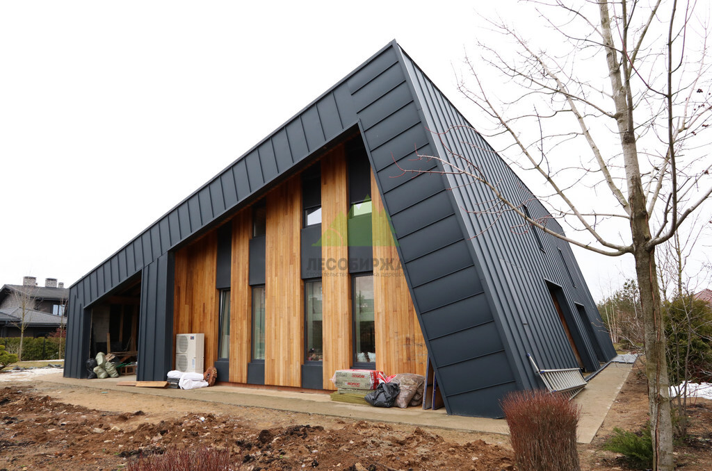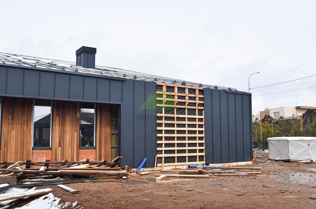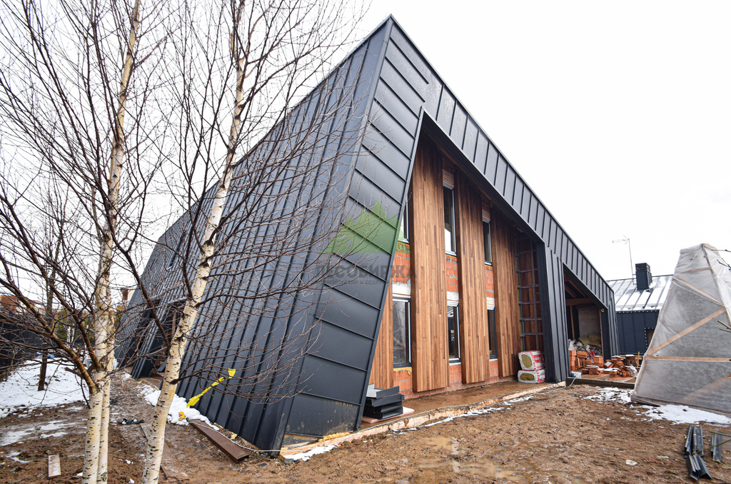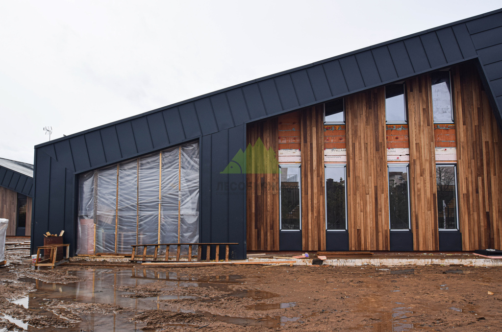 Клиент обратился в Лесобиржу-Спб с комплексной задачей по внешней отделке своего загородного дома в коттеджном поселке Карельский Ключ, расположенном в Ленинградской области. Его ключевым желанием было не просто обшить фасад, а создать по-настоящему уникальный, современный и долговечный архитектурный облик, способный выдерживать специфические погодные условия региона – высокую влажность и значительные перепады температур. Заказчик стремился к эстетическому превосходству и функциональной надежности. В частности, он выразил интерес к использованию комбинированного фасада с применением инновационных материалов. Перед нашими специалистами стояла задача разработать и смонтировать надежную металлическую подсистему, выполнить качественное утепление "пирога" фасада и осуществить чистовую отделку с использованием прямого планкена из термоясеня и фальцевых листов. Особое внимание уделялось вертикальной укладке планкена "вразбежку" для создания динамичного и оригинального рисунка, а также обеспечению идеальной геометрии и цветовой гармонии фасада. Клиент ожидал получить не только визуально привлекательный, но и максимально функциональный, энергоэффективный и простой в уходе фасад, который служил бы долгие годы, подтверждая его выбор в пользу натуральных и современных решений. Основные характеристики объекта: