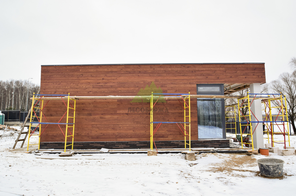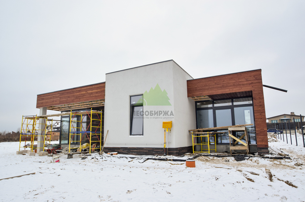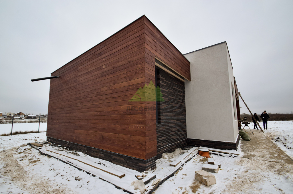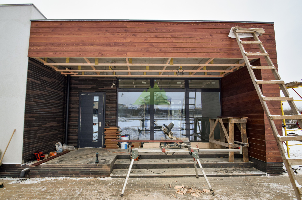 В Лесобиржу-Спб обратился заказчик с непростой, но вдохновляющей задачей: превратить фасад его одноэтажного загородного дома в поселке Красавица, расположенном в живописном уголке Ленинградской области, в подлинное архитектурное произведение. Дом, изначально построенный из пеноблоков, обладал необычной, почти индустриальной эстетикой с огромными панорамными окнами, что делало его воздушным и светлым, но одновременно требовало нестандартного подхода к отделке. Клиент стремился к созданию долговечного, выразительного фасада, сочетающего тепло натурального дерева с современными отделочными материалами, а также требовал исключительной точности в монтаже скошенного планкена с угловыми запилами под 45 градусов. Этот проект стал для нашей команды не просто очередной работой, а возможностью продемонстрировать глубокий опыт и мастерство Лесобиржи-Спб в реализации самых сложных и "ювелирных" идей.