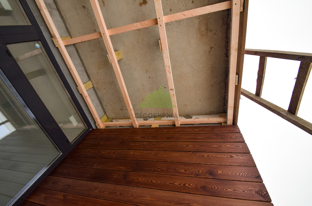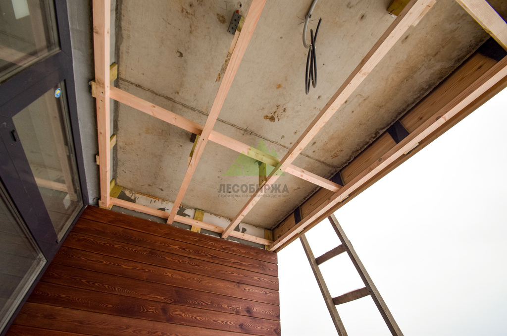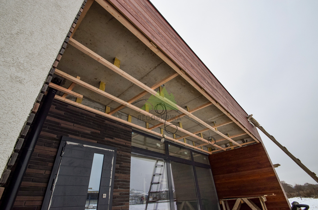 Подшив потолка кровли также был выполнен с применением деревянной обрешетки из строганых брусков сосны прямоугольного сечения (50х40х1500 мм), которые, как и все деревянные элементы проекта, прошли антисептическую обработку в нашем производственном цеху. Для отделки потолочной части и оптимизации бюджета заказчика мы предложили использовать доску из сосны. Учитывая, что все материалы проходят глубокую обработку антисептиками, они становятся устойчивыми к внешним факторам и вредителям, обеспечивая долговечность даже в условиях открытого воздействия. Крепление досок выполнялось саморезами с антикоррозийным покрытием в пласть.