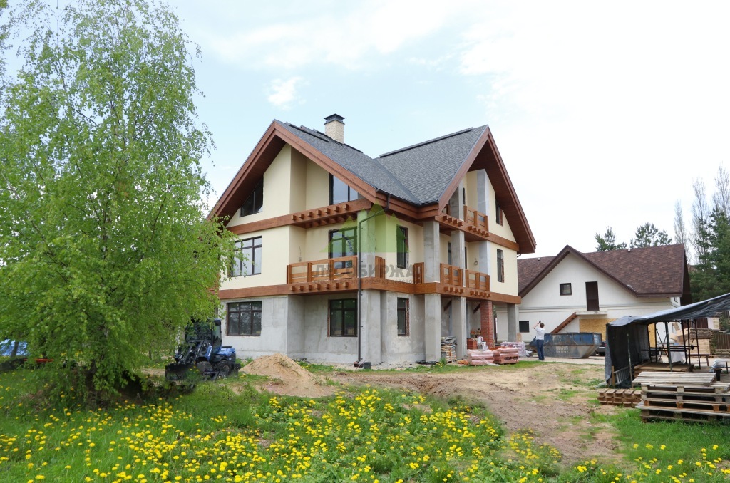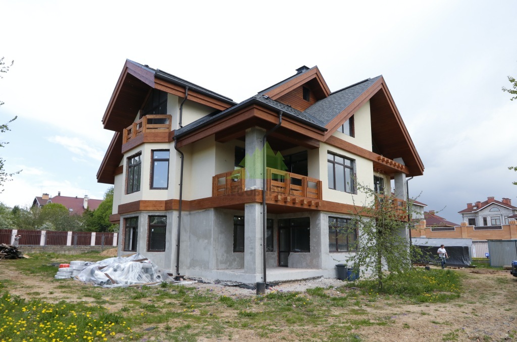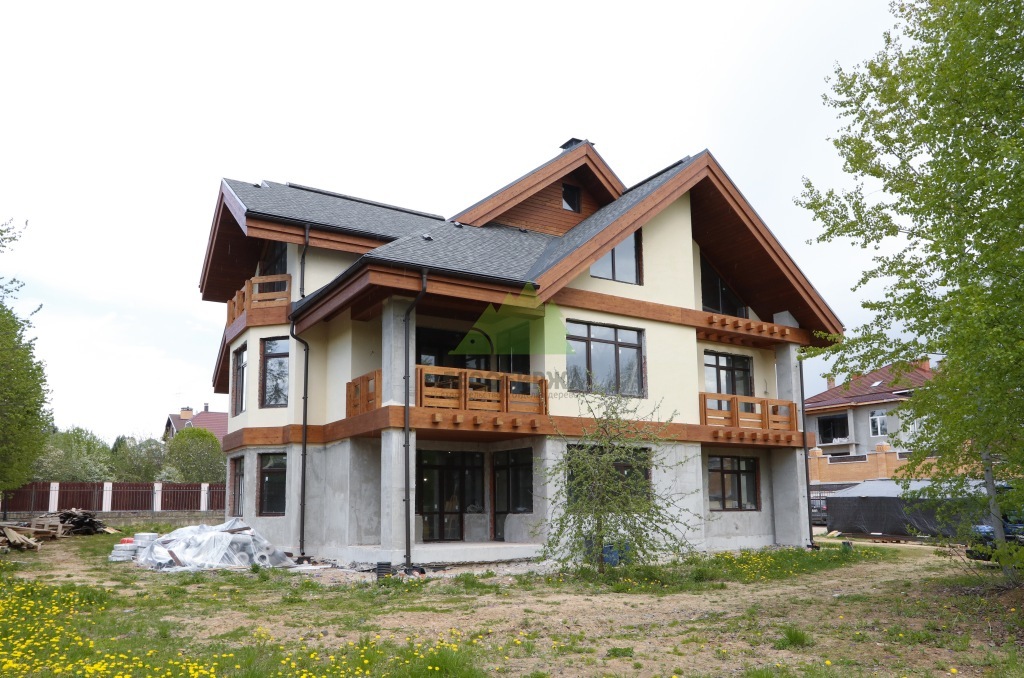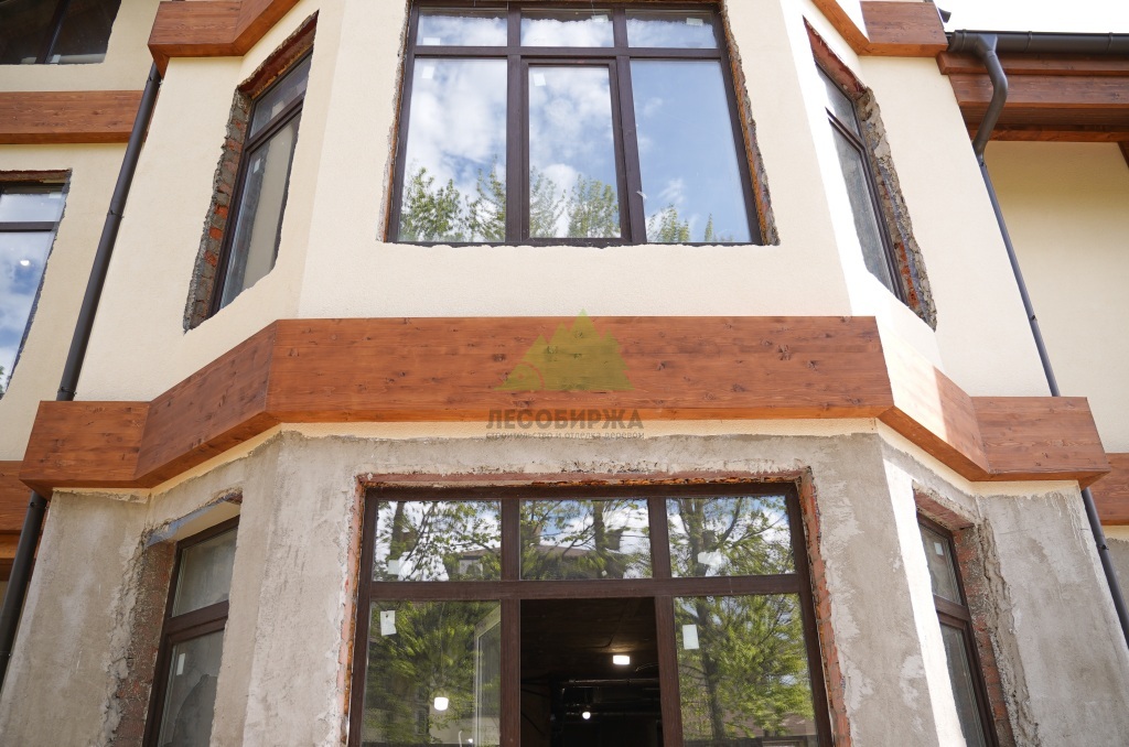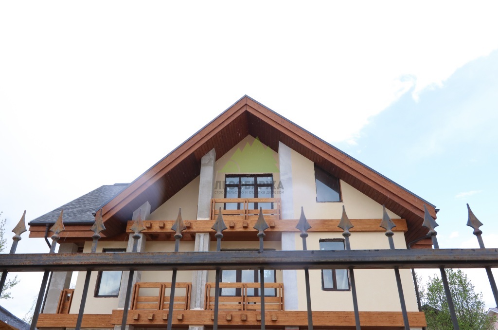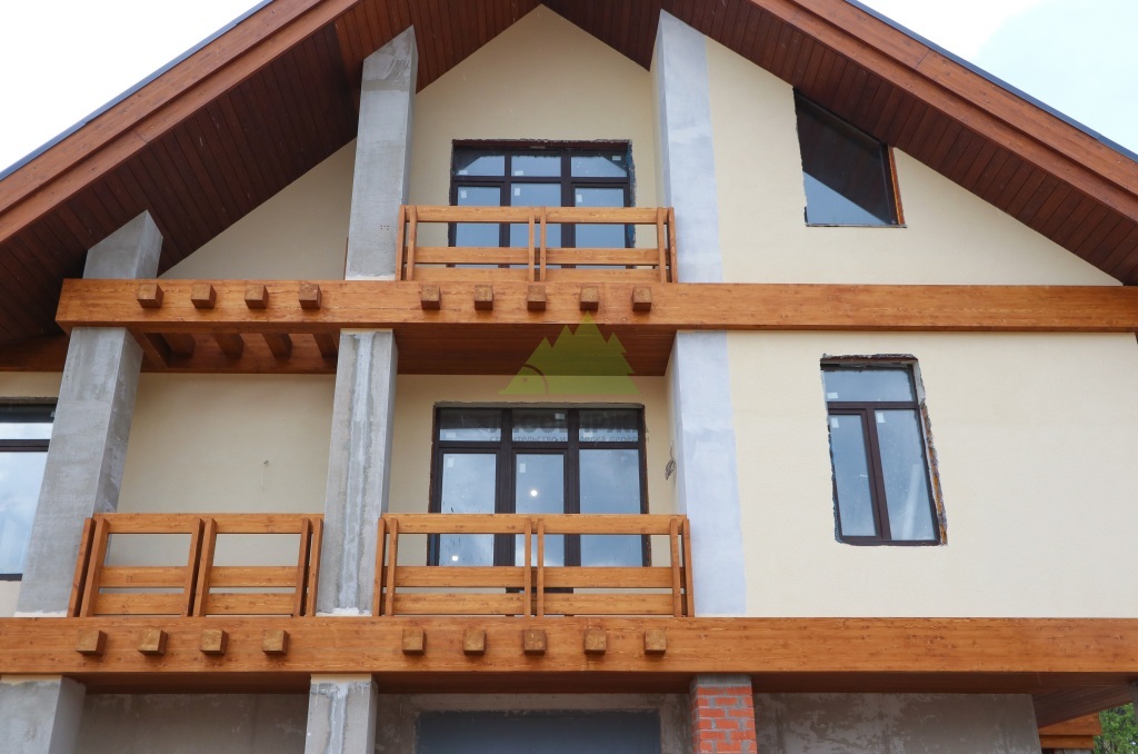 Штукатурка наносилась в несколько слоев. Сначала – выравнивающий слой, затем – армирующий слой со щелочестойкой сеткой, который предотвращает появление микротрещин и увеличивает механическую прочность фасада. Финишный декоративный слой создавался с текстурой, имитирующей натуральный камень, что придавало дому солидность и благородство. Наши штукатуры, обладающие многолетним опытом, добились идеально ровной поверхности и четких линий, что стало великолепной основой для последующей установки деревянных элементов. Все работы проводились с соблюдением технологических перерывов для полного высыхания каждого слоя, что является залогом качества и долговечности покрытия.