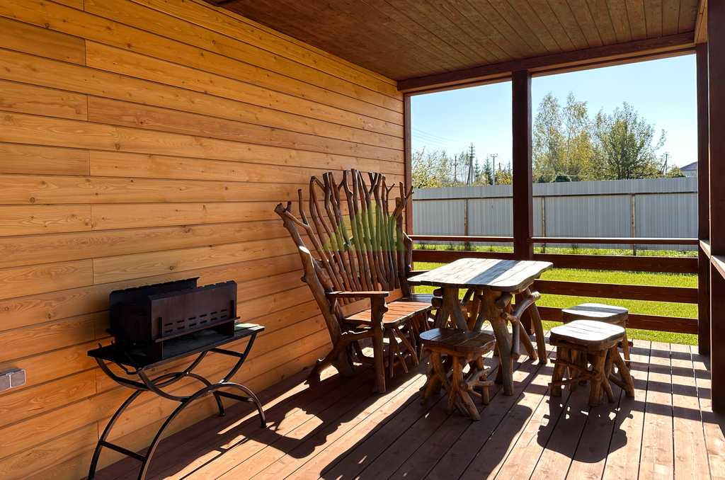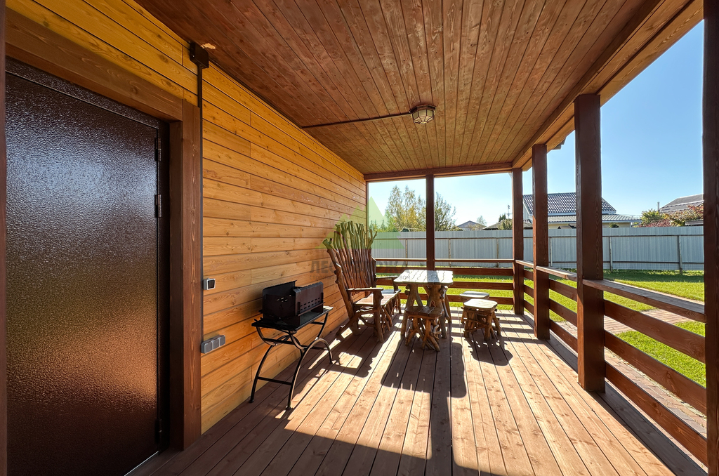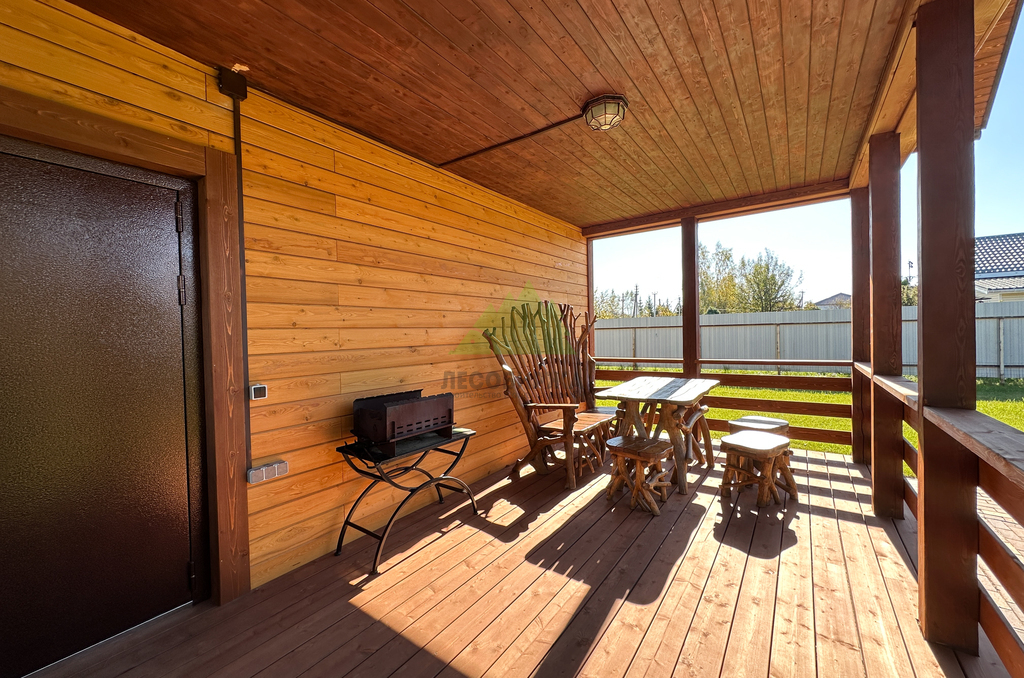Свесы и потолки террасы с крыльцом обшили в размер, сохранив вентиляцию и чистые примыкания. Здесь важна дисциплина реза и аккуратность крепёжных узлов — красота не должна мешать физике, иначе потом вся эстетика обидится.