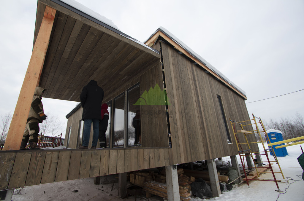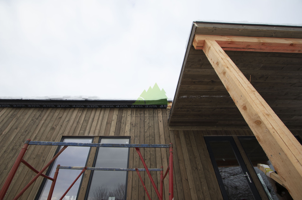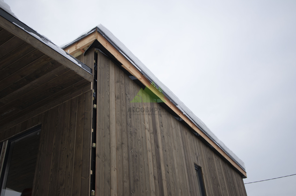 Вертикальный монтаж планкена был выбран неслучайно. Такое решение не только придает фасаду динамичный и современный вид, визуально "вытягивая" здание вверх, но и имеет практическое значение. Вертикально расположенные панели способствуют более эффективному стоку дождевой воды, что минимизирует ее задержку на поверхности и, соответственно, снижает нагрузку на защитное покрытие. Для крепления использовались скрытые крепежи CAMO. Это инновационная система, которая позволяет зафиксировать планкен без видимых элементов крепежа на лицевой поверхности. Крепежи CAMO устанавливаются в боковую кромку доски под углом, обеспечивая надежное сцепление с обрешеткой и сохраняя безупречный внешний вид. Отсутствие видимых шурупов или гвоздей не только эстетически привлекательно, но и защищает древесину от дополнительных точек проникновения влаги, что продлевает срок службы всего фасада.