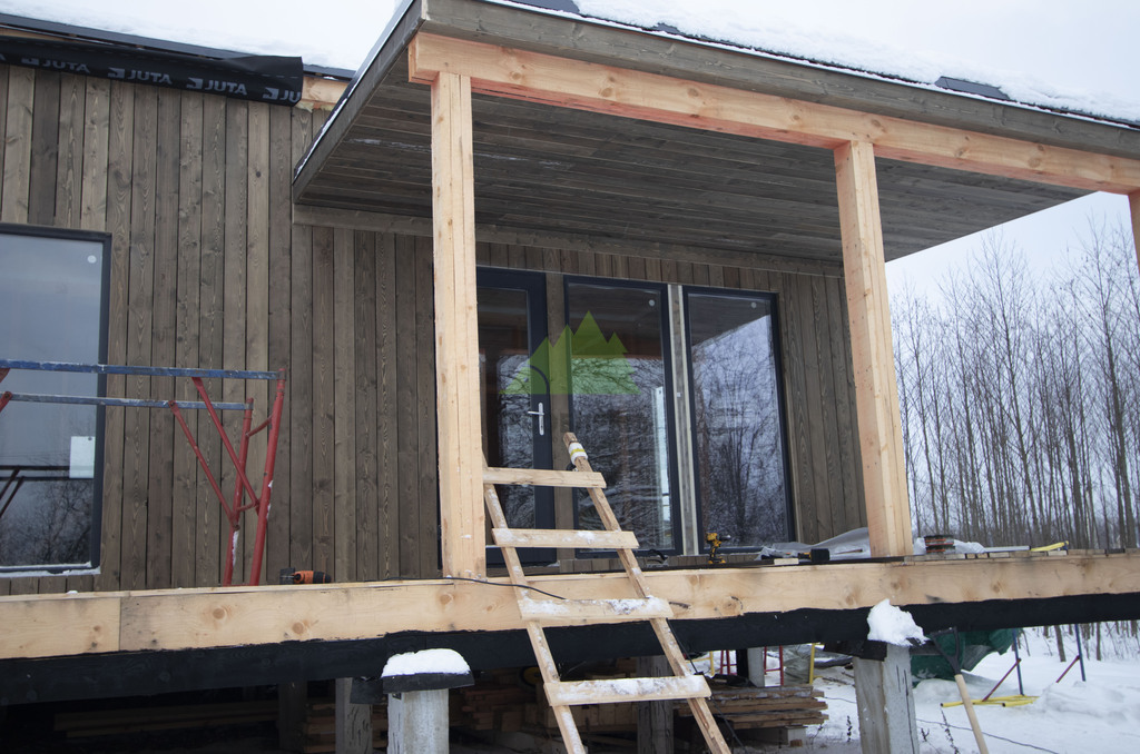 - Эстетичный внешний вид. Идеально гладкие дощечки с благородной текстурой сосны, окрашенные в выбранный клиентом оттенок, придали каркасному дому вид современного скандинавского коттеджа. Фасад выглядит дорого, аккуратно и очень стильно, подчеркивая индивидуальность строения.