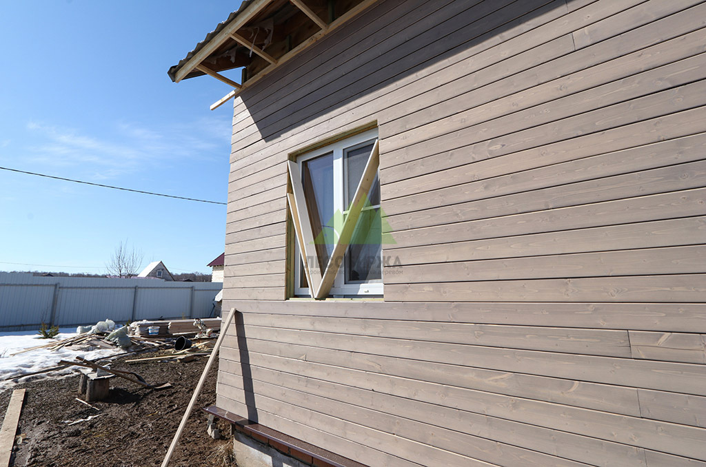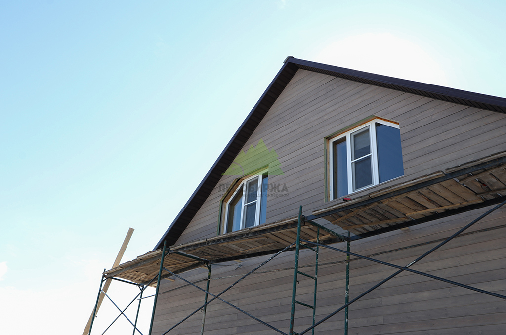 Для цокольной части дома и некоторых акцентных элементов, как было оговорено с клиентом, мы использовали современный полимерный сайдинг. Это практичное и долговечное решение, которое отлично дополняет деревянный планкен, создавая интересный контраст текстур и обеспечивая дополнительную защиту от механических повреждений и влаги в нижней части строения. Сайдинг был выбран в оттенке, гармонирующем с цветом планкена и кровли, что позволило создать единый и завершённый архитектурный ансамбль. Монтаж сайдинга проводился в строгом соответствии с технологическими картами производителя, с учётом температурных расширений материала. Были установлены стартовые, финишные профили, а также угловые элементы, обеспечивающие аккуратный и герметичный стык. Особое внимание уделялось вентиляции подсайдингового пространства, чтобы избежать скопления влаги. На этом этапе также были предусмотрены и установлены декоративные наличники для окон и дверей, выполненные из того же материала, что и планкен, но с финишным покрытием, соответствующим цветовой гамме фасада, что придало дому дополнительную изысканность.
