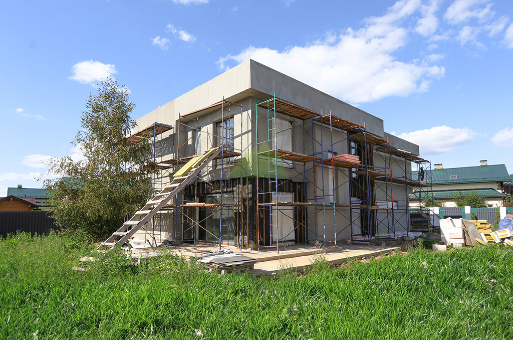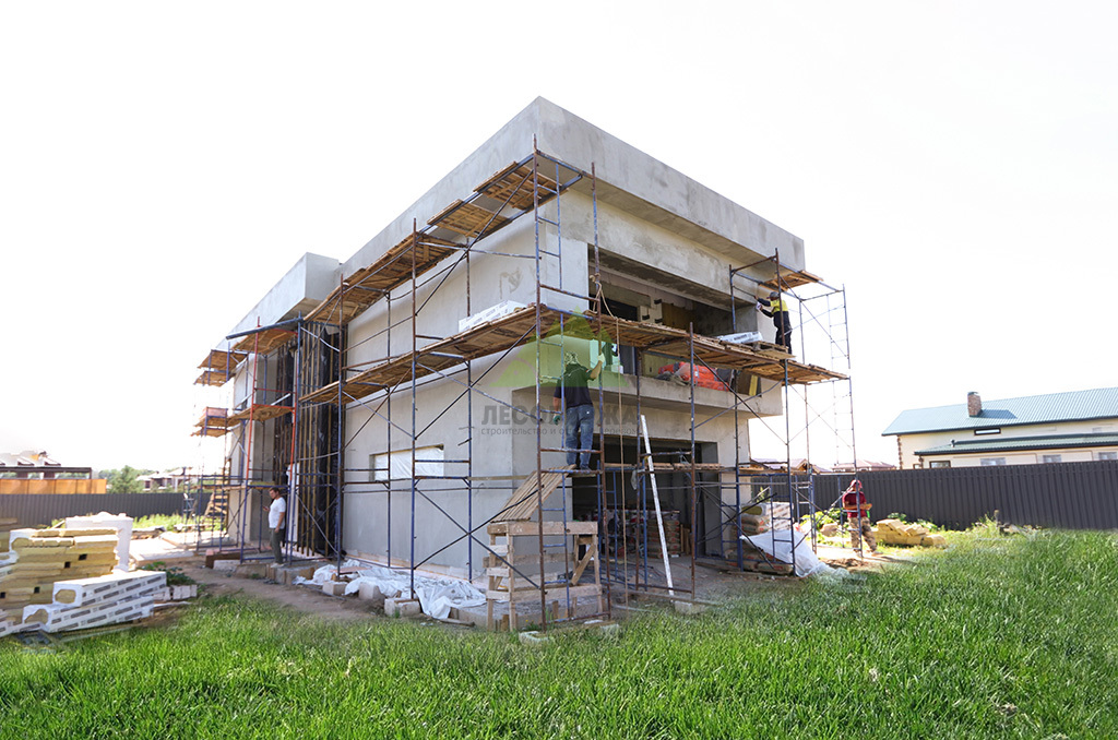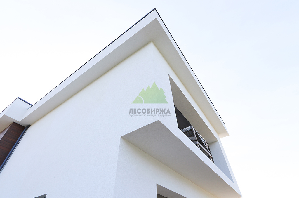 Далее, поверх армирующей сетки, последовательно наносились выравнивающий и финишный слои штукатурки. Цвет финишного покрытия был заранее тщательно подобран в соответствии с дизайн-проектом, что позволило избежать необходимости последующей окраски и обеспечило равномерность тона и текстуры по всей площади фасада. Благодаря этой технологии, вся застройка участка – дом, баня и гараж – мгновенно обрела стильный и респектабельный вид, соответствующий высоким стандартам "хай-тек".
