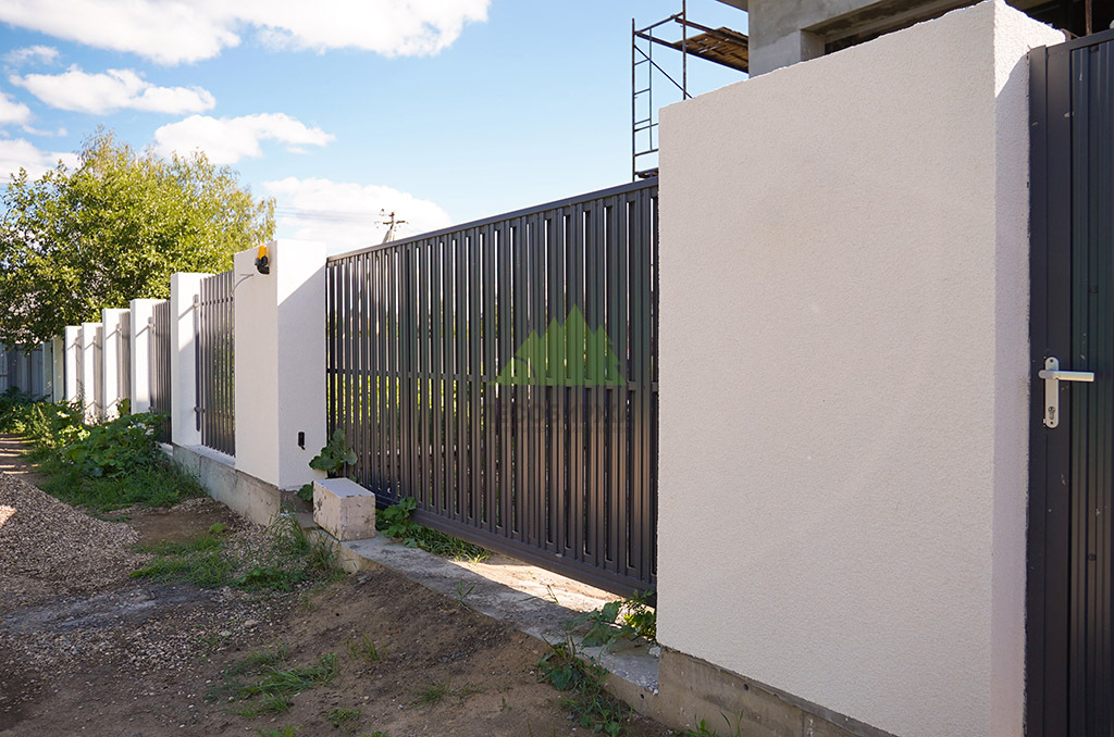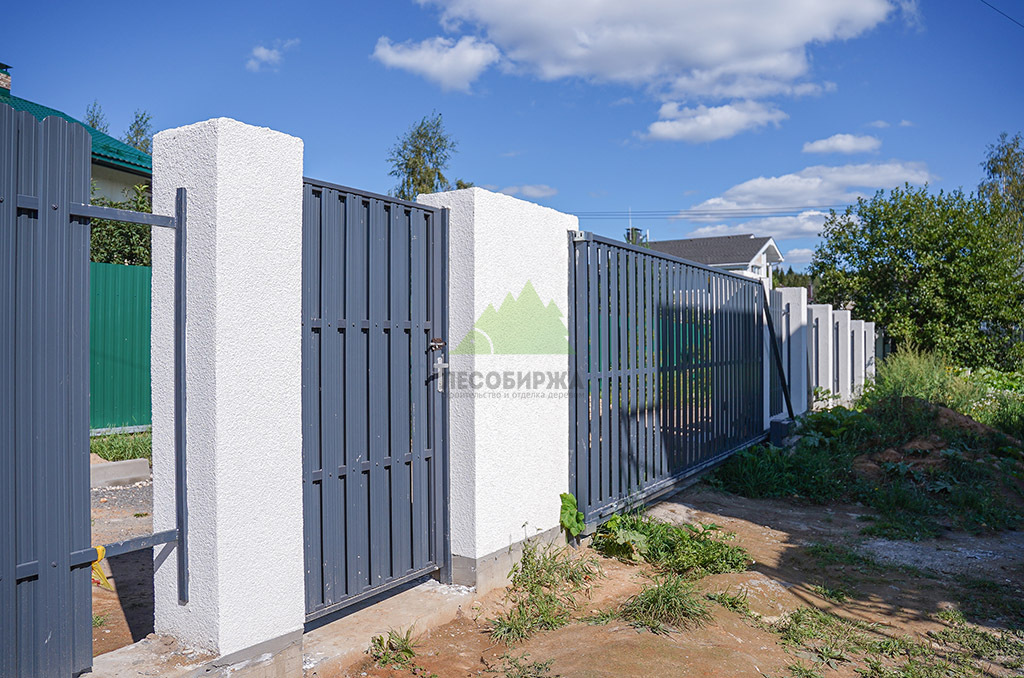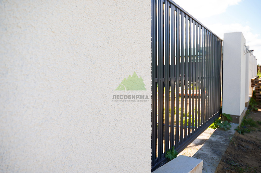 Оштукатуривание не ограничилось только стенами зданий. Наши мастера также профессионально оштукатурили столбы массивного забора, окружающего участок. Это решение позволило создать единую цветовую гамму и стилистику для всех элементов усадьбы, гармонично вписав их в общую архитектурную концепцию и подчеркнув внимание к деталям, которое всегда отличает работу "Лесобиржа-Спб".