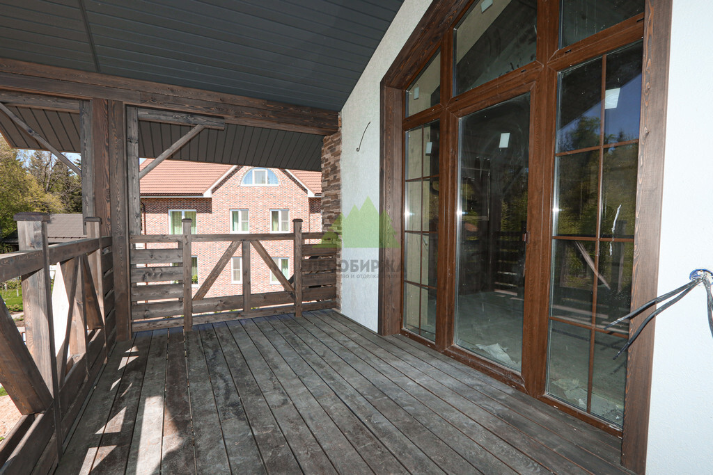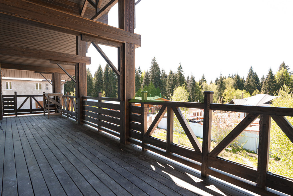 Реализация проекта проходила в несколько этапов. На первом этаже мы тщательно подготовили основание для террасы и уложили палубную доску из лиственницы, создав прочное и красивое покрытие, которое будет радовать владельцев многие годы. Затем, следуя стилистике Шале, наши мастера приступили к монтажу декоративных ограждений, которые не только обеспечивают безопасность, но и служат важным элементом дизайна. Потолок, ригели, дверные откосы и наличники были искусно обшиты планкеном из лиственницы, создавая единое гармоничное пространство.