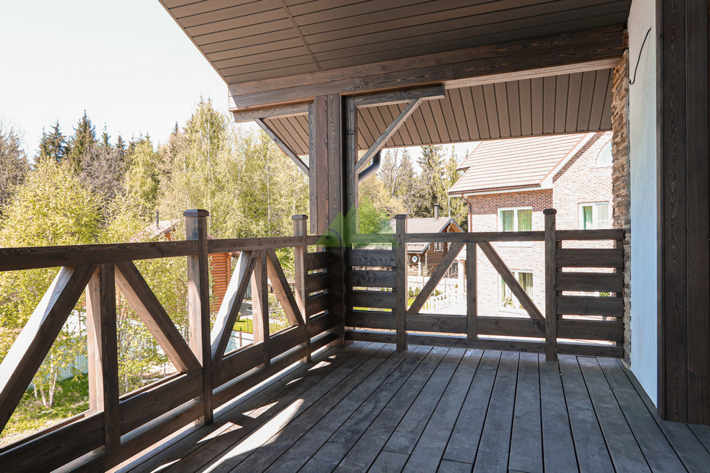 Особое внимание было уделено балкону второго этажа. Здесь мы воплотили в жизнь задумку клиента, обшив его вертикальными балками, которые придают строению характерный для Шале облик. Декоративные элементы, откосы и наличники балкона также выполнены из лиственничного планкена, обеспечивая визуальную целостность всего фасада. Благодаря предварительно выполненной отделке камнем, которую уже имел коттедж, наши деревянные элементы идеально дополнили существующий дизайн, подчеркнув многообразие фактур и материалов, столь свойственное альпийскому стилю.