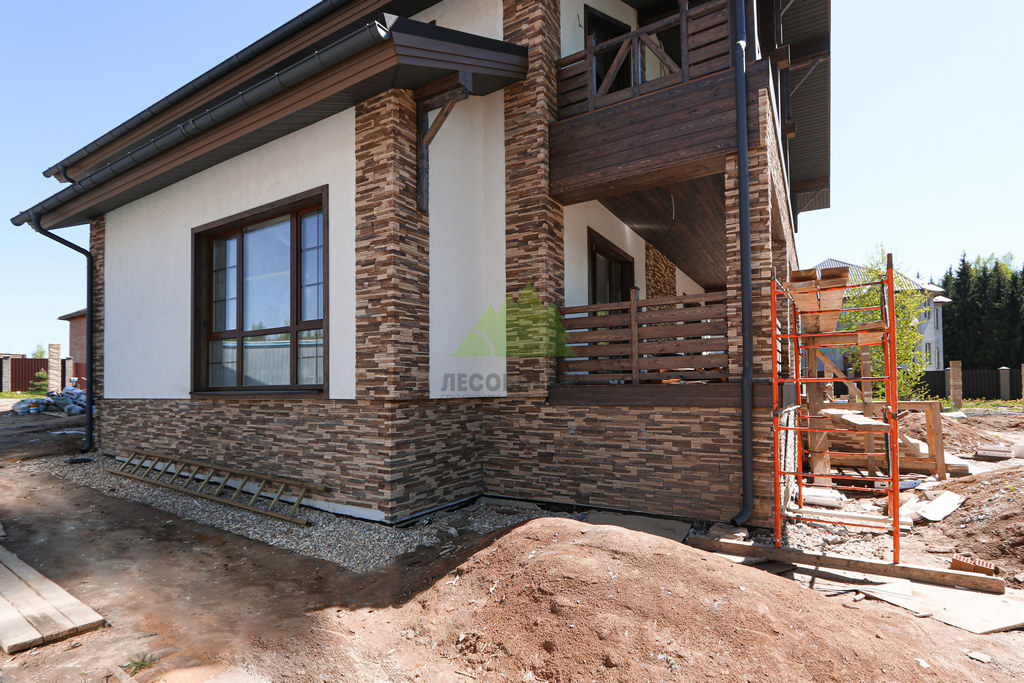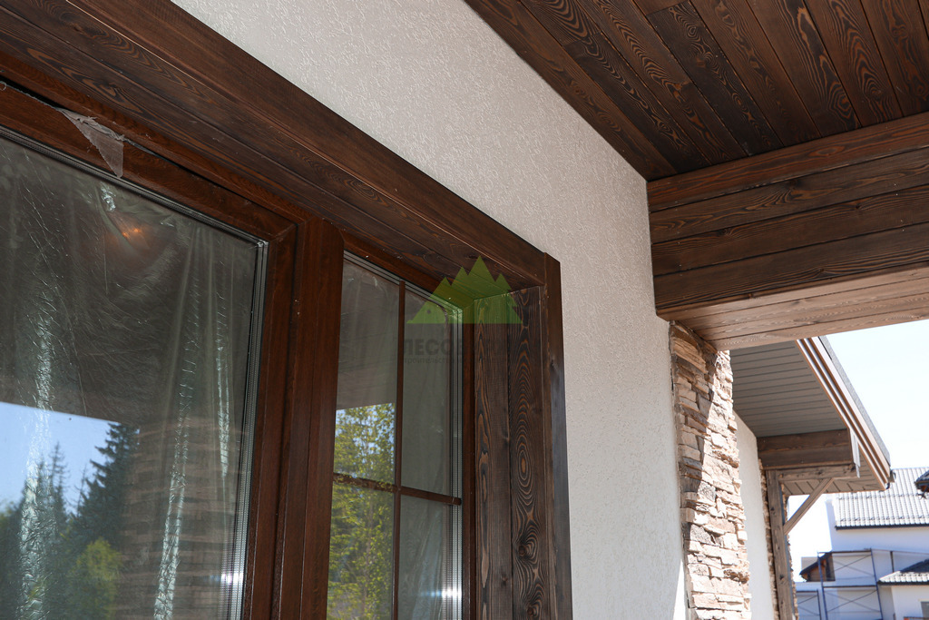 Перед нами стояла задача не просто выполнить отделочные работы, а создать целостный и долговечный архитектурный ансамбль. Клиент ясно обозначил свои пожелания: на первом этаже необходимо было обустроить пол из высококачественной лиственницы, смонтировать элегантные декоративные ограждения, обшить потолок, ригели, откосы и наличники планкеном. Балкон второго этажа требовал обшивки вертикальными балками, а также оформления декоративными элементами, откосами и наличниками в едином стиле. Особое внимание уделялось сочетанию натуральных материалов – дерева и уже имеющейся каменной отделки, чтобы достичь истинной атмосферы Шале.