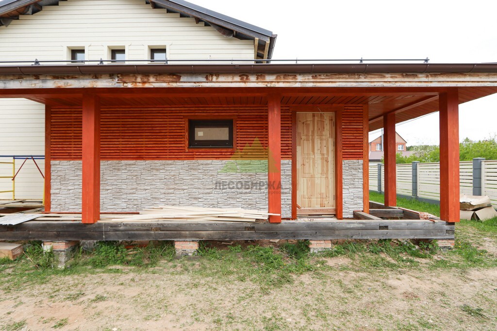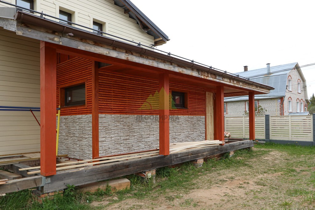 - Изысканный внешний вид: Скошенный планкен из сосны создаёт на фасаде неповторимый рельефный узор, который виртуозно сочетается с другими отделочными материалами. В этом проекте гармония дерева и имитации камня на террасе достигла высшей точки, вызвав восхищение у заказчика и наших специалистов.