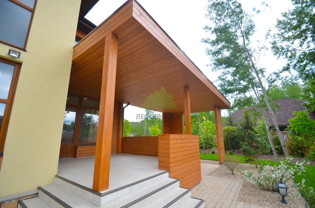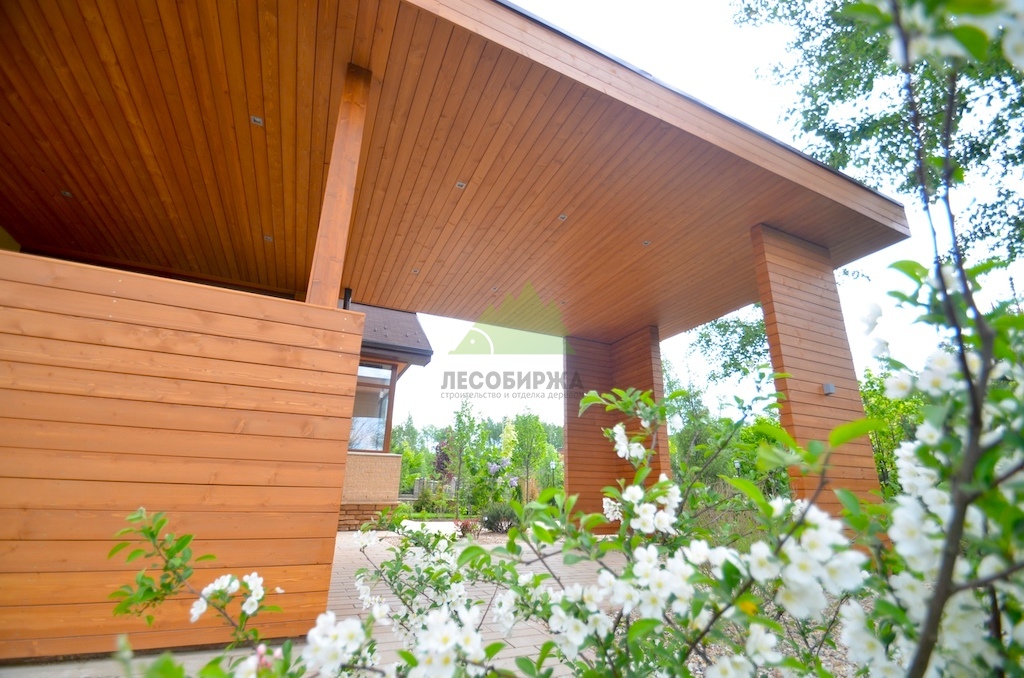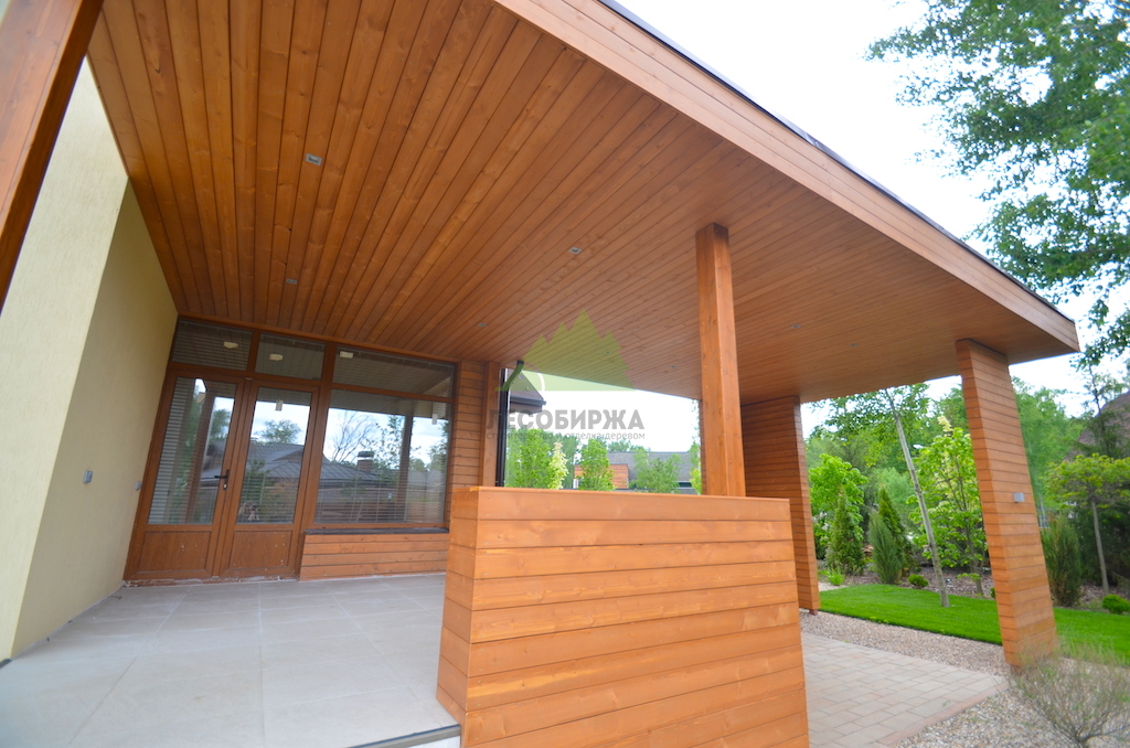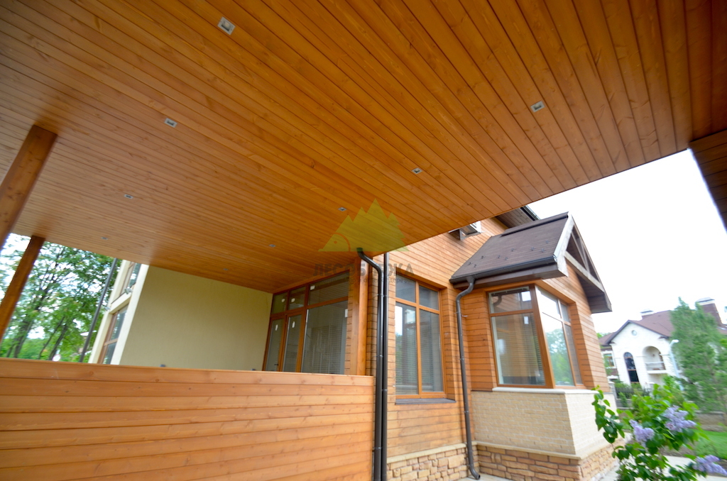 Помимо основных фасадных работ, мы также выполнили полную отделку свесов кровли и колонн террасы. Эти элементы, часто недооцениваемые, играют огромную роль в общем восприятии дома. Неухоженные свесы могут испортить впечатление от самого роскошного фасада. Для зашивки свесов и облицовки колонн был также использован прямой планкен из лиственницы, обработанный в тон основному фасаду. Это решение не только обеспечило защиту подкровельного пространства и несущих конструкций террасы, но и добавило зданию благородства и завершенности. Особое внимание было уделено функциональности террасы: для комфортного пребывания в темное время суток в потолок террасы были интегрированы современные светильники, создающие уютную и гостеприимную атмосферу.