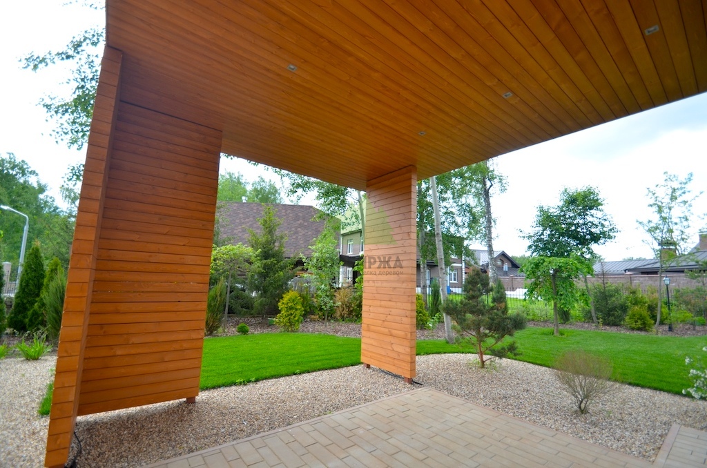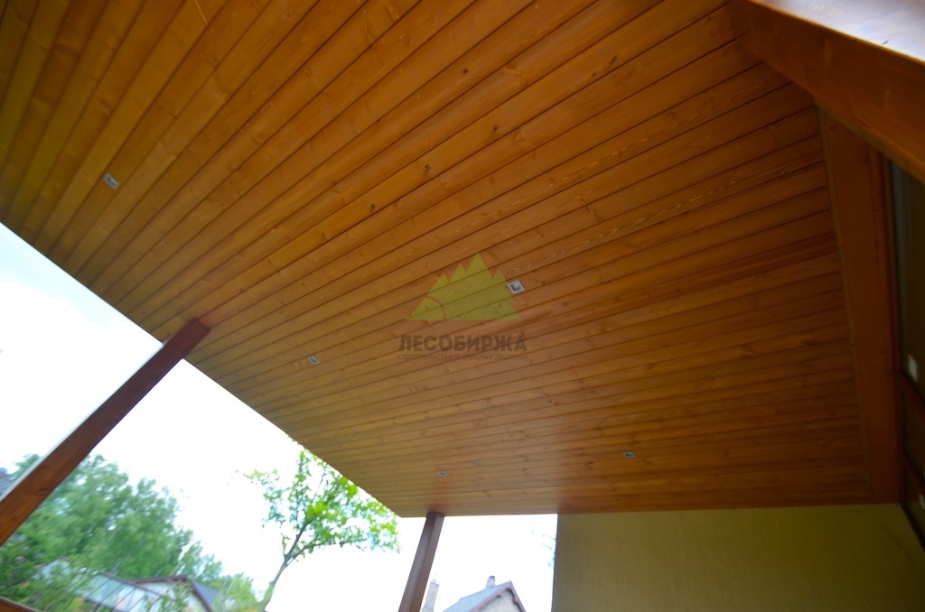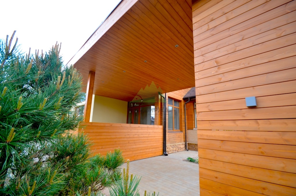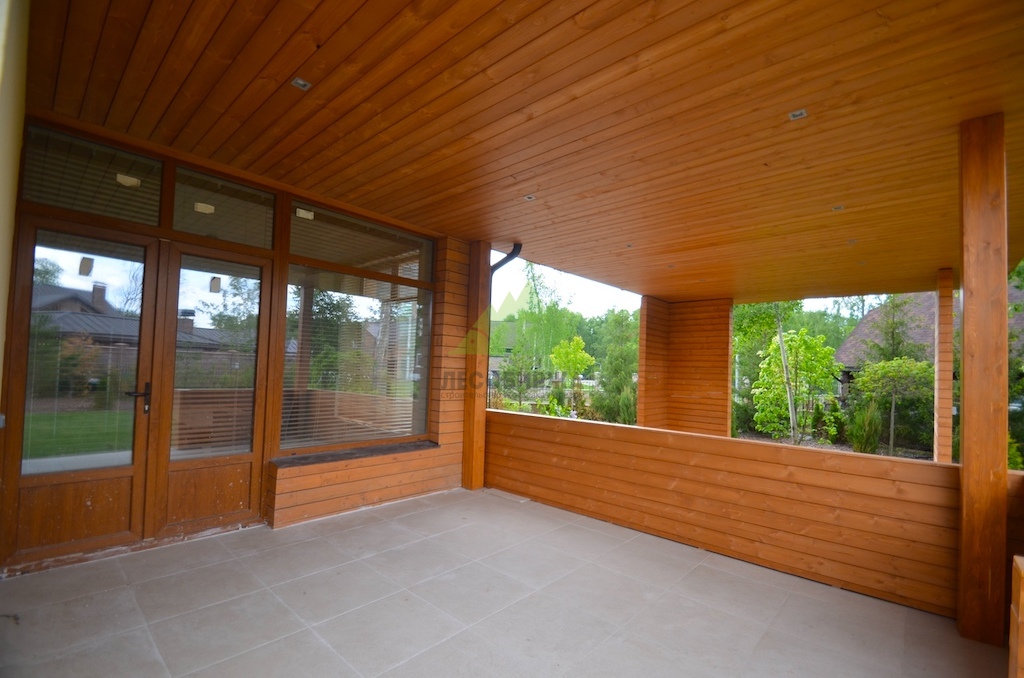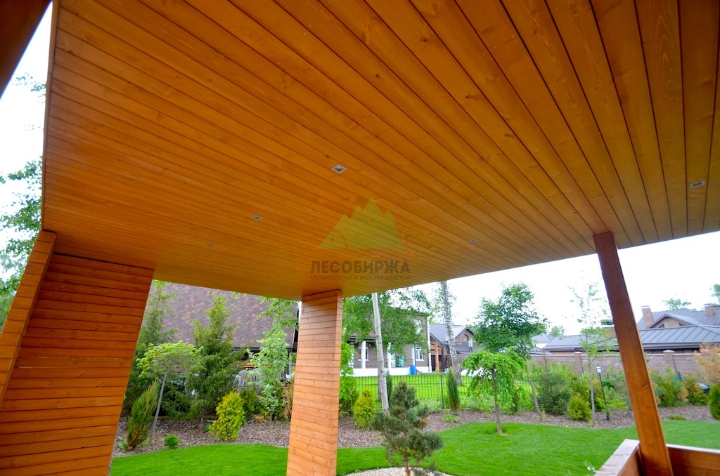 Помимо основных фасадных работ, мы также выполнили полную отделку свесов кровли и колонн террасы. Эти элементы, часто недооцениваемые, играют огромную роль в общем восприятии дома. Неухоженные свесы могут испортить впечатление от самого роскошного фасада. Для зашивки свесов и облицовки колонн был также использован прямой планкен из лиственницы, обработанный в тон основному фасаду. Это решение не только обеспечило защиту подкровельного пространства и несущих конструкций террасы, но и добавило зданию благородства и завершенности. Особое внимание было уделено функциональности террасы: для комфортного пребывания в темное время суток в потолок террасы были интегрированы современные светильники, создающие уютную и гостеприимную атмосферу.
