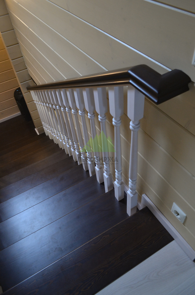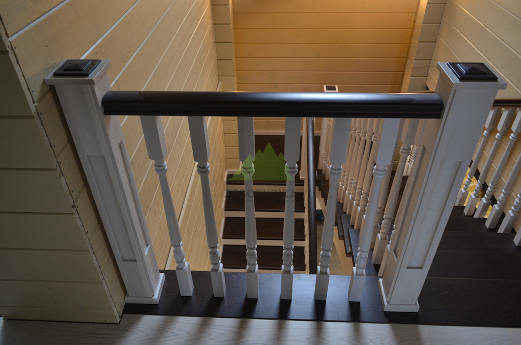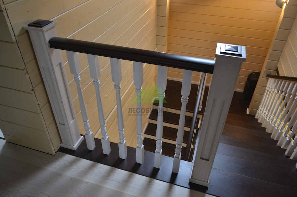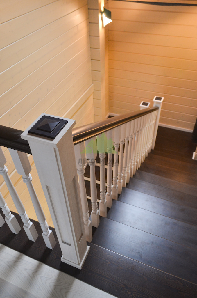 Вопрос безопасности был решен с присущим Лесобирже-Спб вниманием к деталям. На втором марше было выполнено двойное ограждение – это не только оригинальное дизайнерское решение, но и целенаправленная мера по усилению конструкции и обеспечению максимальной безопасности на этом участке. Наши специалисты после тщательных расчетов предложили этот вариант, и он был с одобрением принят заказчиком как наиболее удачный и функциональный. Ограждение лестничных маршей оформлено с большим вкусом: точеные, фигурные балясины и оригинальной формы столбы создают впечатление прочности и основательности.