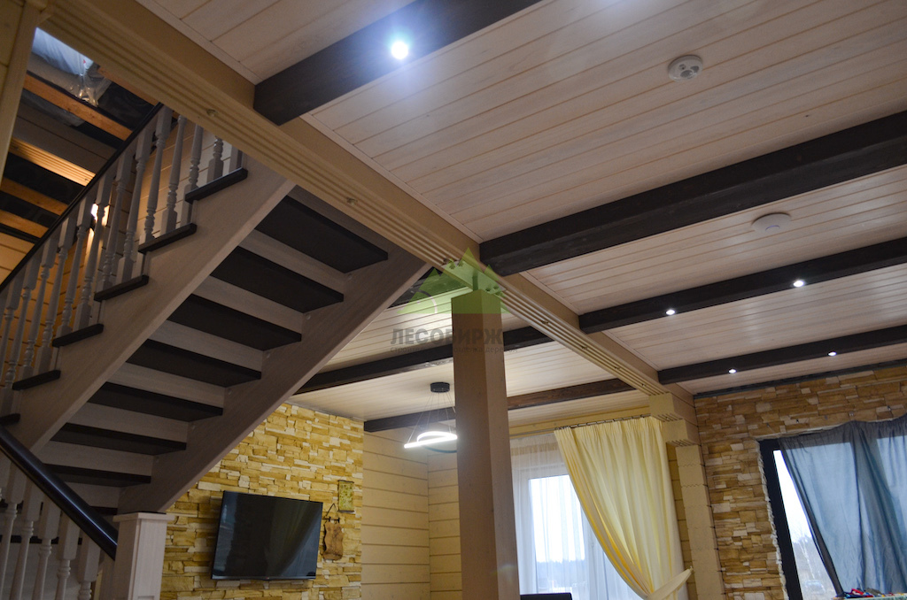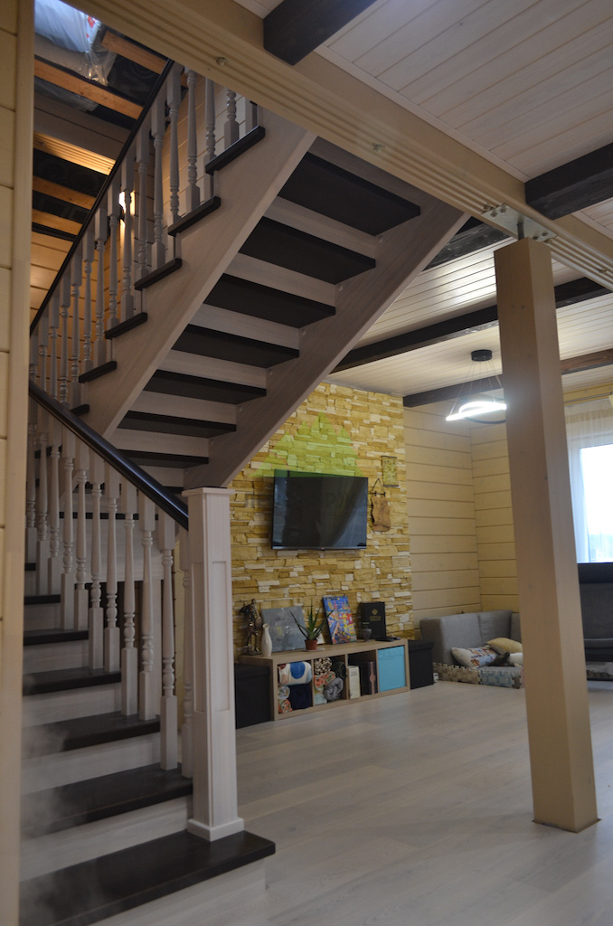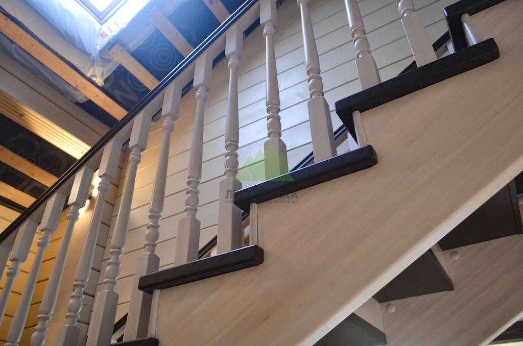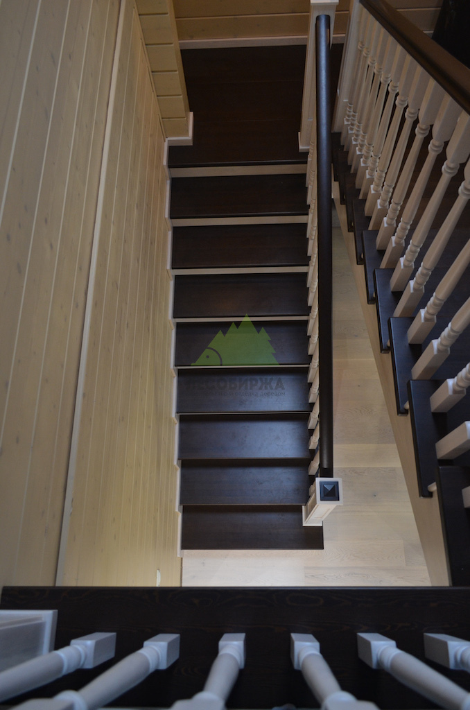 Особое внимание было уделено цветовому решению и финишной отделке. Вся конструкция лестницы, включая балясины, столбы, подступенки и уникальные пирамидальные оголовки, была окрашена в изумительное сочетание двух цветов: насыщенного темного шоколада и чистого белого, создавая эффектный контраст. Использование полупрозрачного оттенка "шоколад" позволило подчеркнуть природную текстуру древесины, придав конструкции особую глубину и благородство. Этот контраст выгодно выделяет изящество и утонченность линий, подчеркивая современный стиль интерьера. Темный оттенок идеально перекликается с цветом декоративных фальшбалок на потолке, объединяя пространство в единую концепцию и создавая впечатление целостности и продуманности.