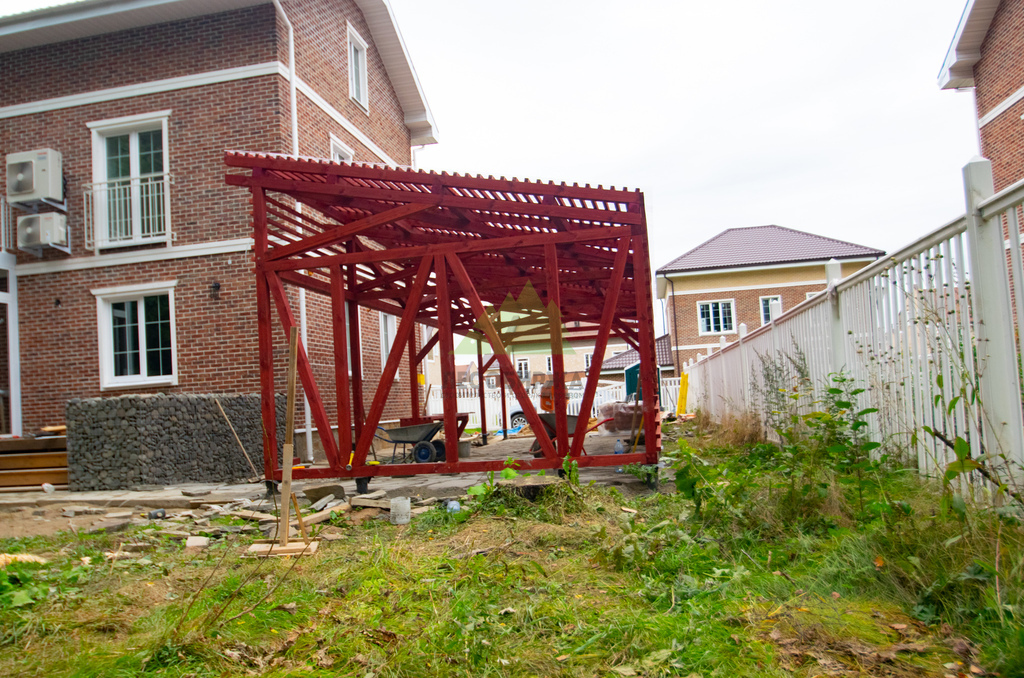 4. Возведение каркасов объектов под крышу. Наши мастера, обладающие глубокими знаниями в работе с деревом, аккуратно и точно смонтировали основные несущие конструкции хозяйственного блока и навеса, подготовив их к последующим этапам отделки. Особое внимание уделялось точности подгонки элементов и надежности креплений, что является залогом прочности и безопасности всей конструкции.