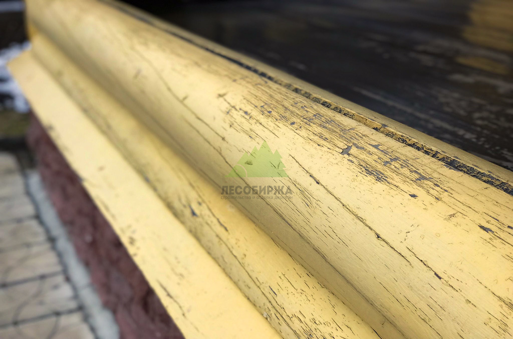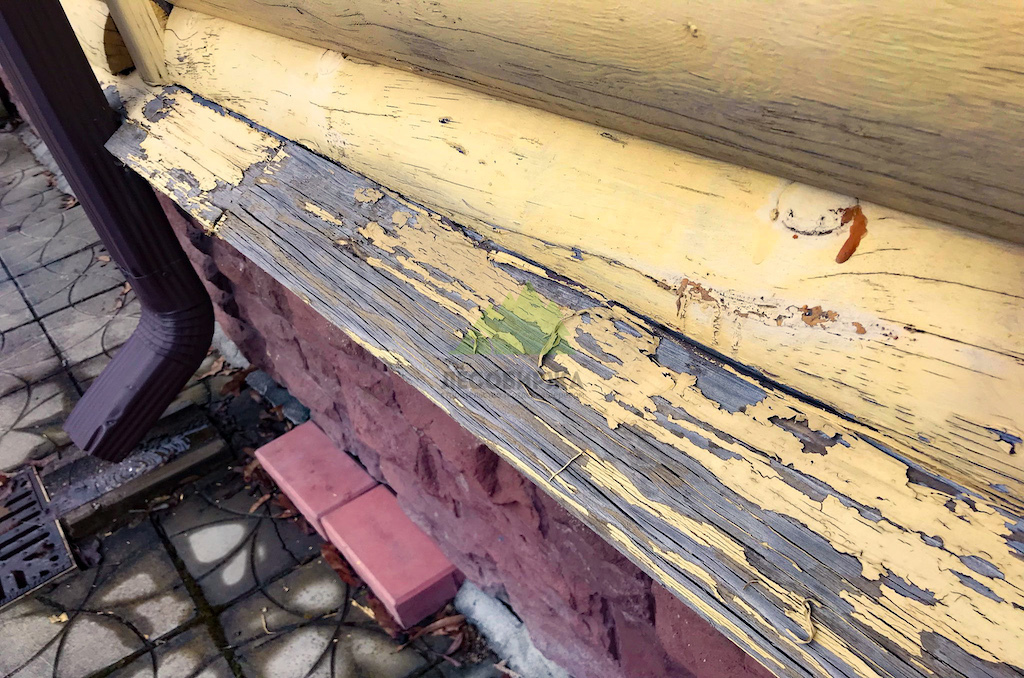 1. Значительное посерение древесины на фасадах обоих домов, особенно в местах отслоения старой краски, что свидетельствовало о разрушении лигнина под воздействием УФ-излучения и влаги.