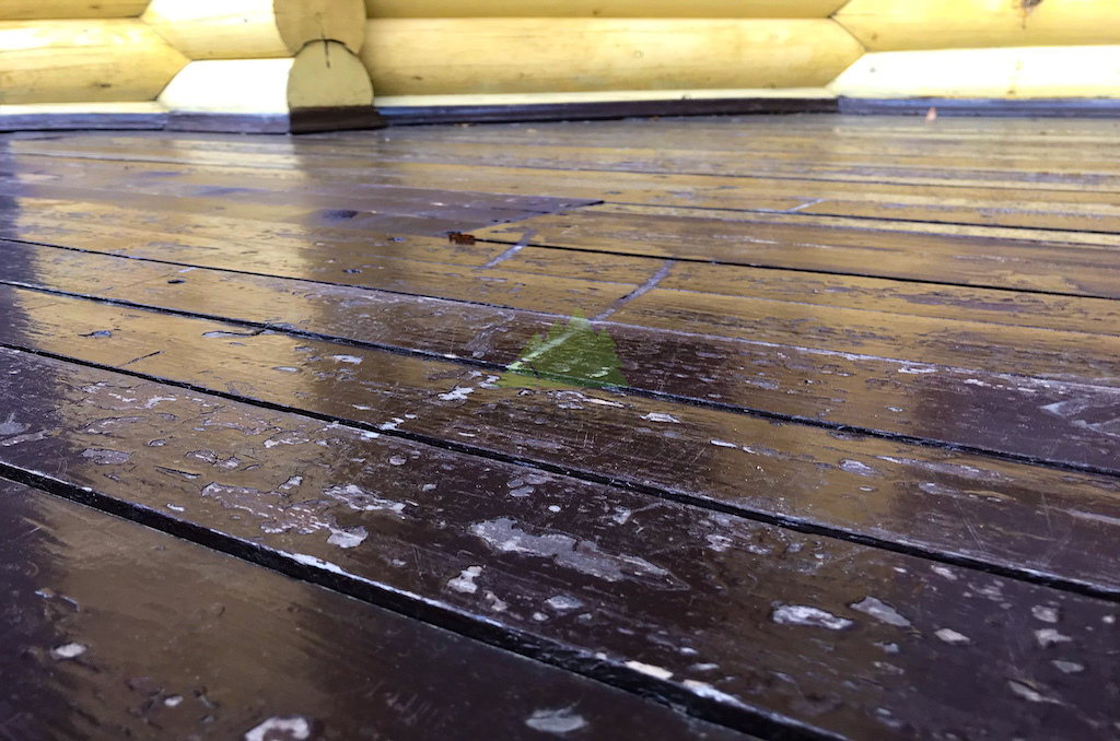 4. Полное разрушение защитного слоя на террасе, с гниением и деформацией досок настила.