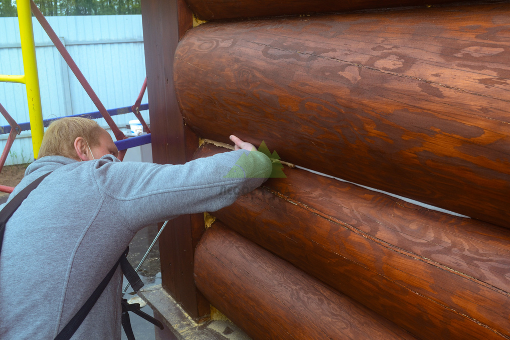 - Подготовка швов. Все межвенцовые пространства и трещины были тщательно очищены от пыли, грязи и мелкого сора, что обеспечило идеальную адгезию герметика.