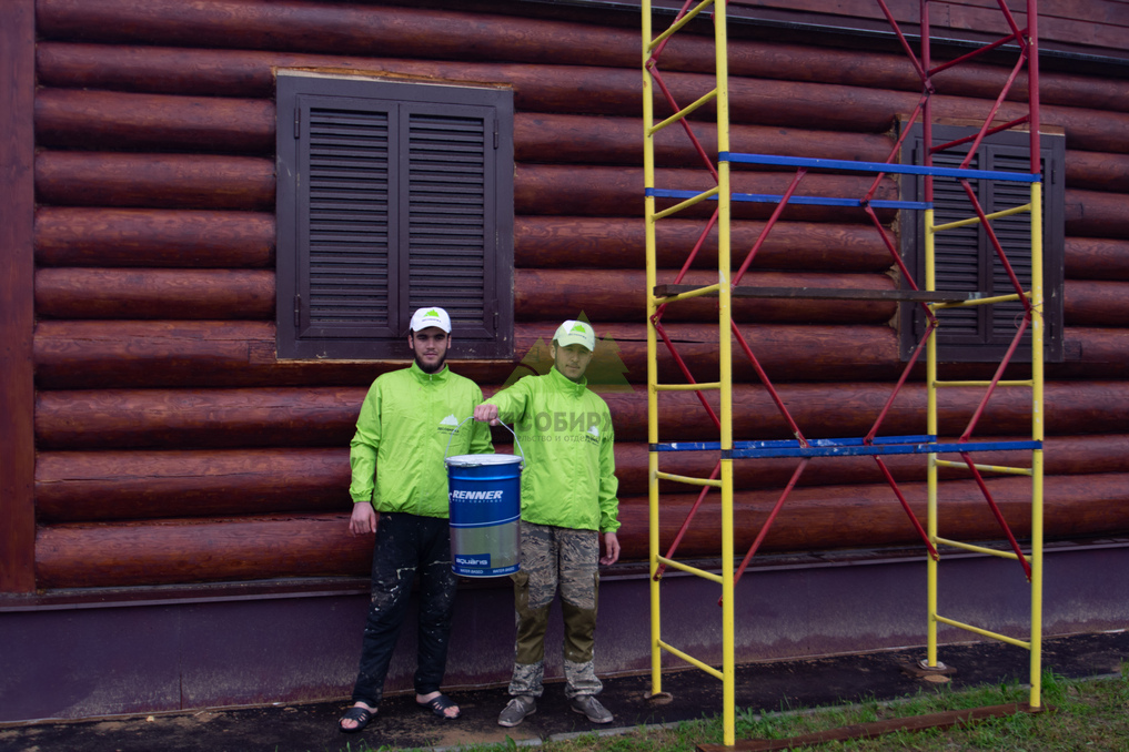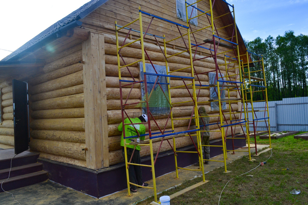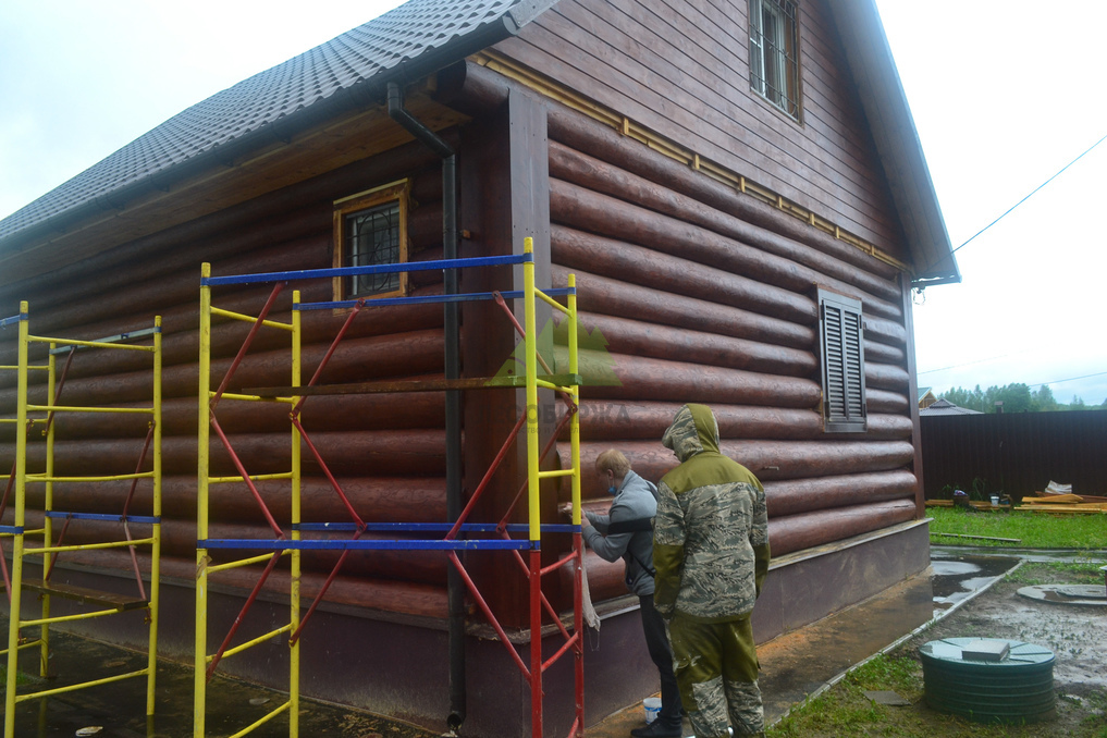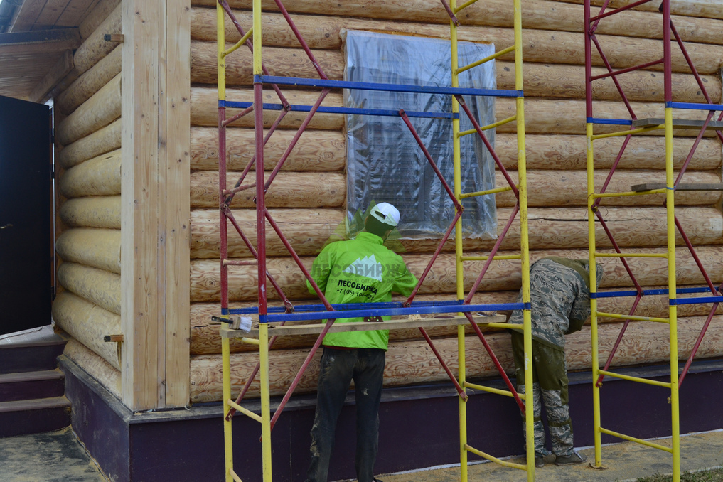 - Нанесение герметика. С помощью профессионального пистолета герметик Remmers равномерно распределялся по межвенцовым швам, заполняя все полости. Затем, используя специализированные шпатели, мастера Лесобиржи-Спб "ювелирно" формировали аккуратные и ровные швы, придавая фасаду завершенный и эстетичный вид.