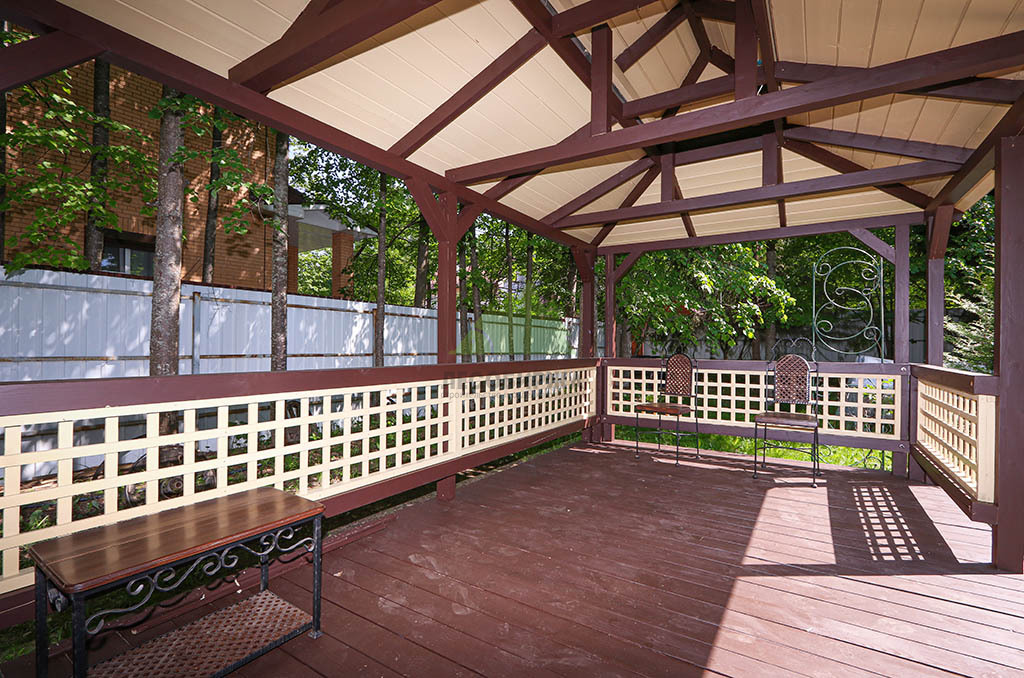 После шлифовки был нанесен грунт "Renner" M101, который глубоко пропитал древесину, подготовив ее к масляному покрытию. По его впитыванию мы так же бережно вышлифовали поверхность, удаляя поднятые пигментом древесные волокна (ворс). Далее следовало нанесение первого слоя масла "Renner" M300. Излишки масла были аккуратно удалены ветошью, чтобы избежать образования пленки и обеспечить глубокое проникновение состава. После высыхания гидромасла, которое происходило в условиях контролируемой влажности, мы провели еще одну промежуточную шлифовку абразивом P200 для устранения мельчайших неровностей и повышения адгезии. Завершающим аккордом стало нанесение второго, финишного слоя масла "Renner" M300, который придал беседке глубокий, благородный коричневый оттенок и надежную защиту.