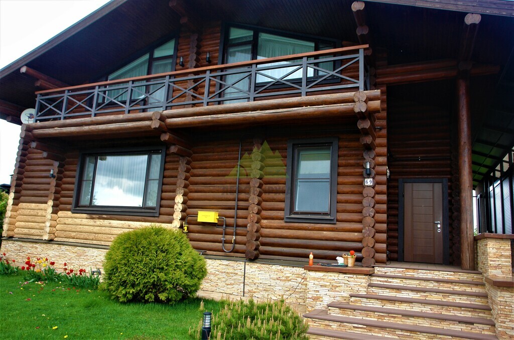 - Повторная покраска финишным слоем гидромасла Renner YS M 300. Для этого дома в Елизавете был выбран глубокий и насыщенный колер в цвете 1824, который превосходно подчеркнул текстуру бревна и придал фасаду благородный, выразительный вид.