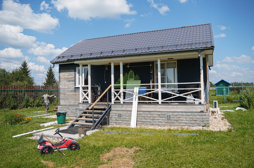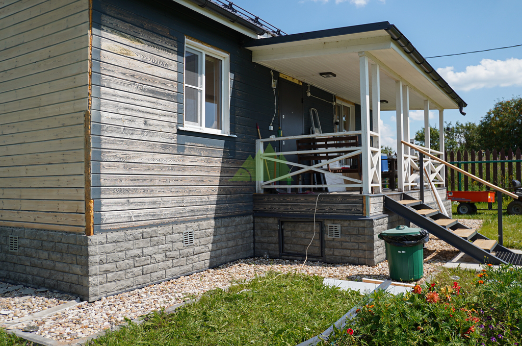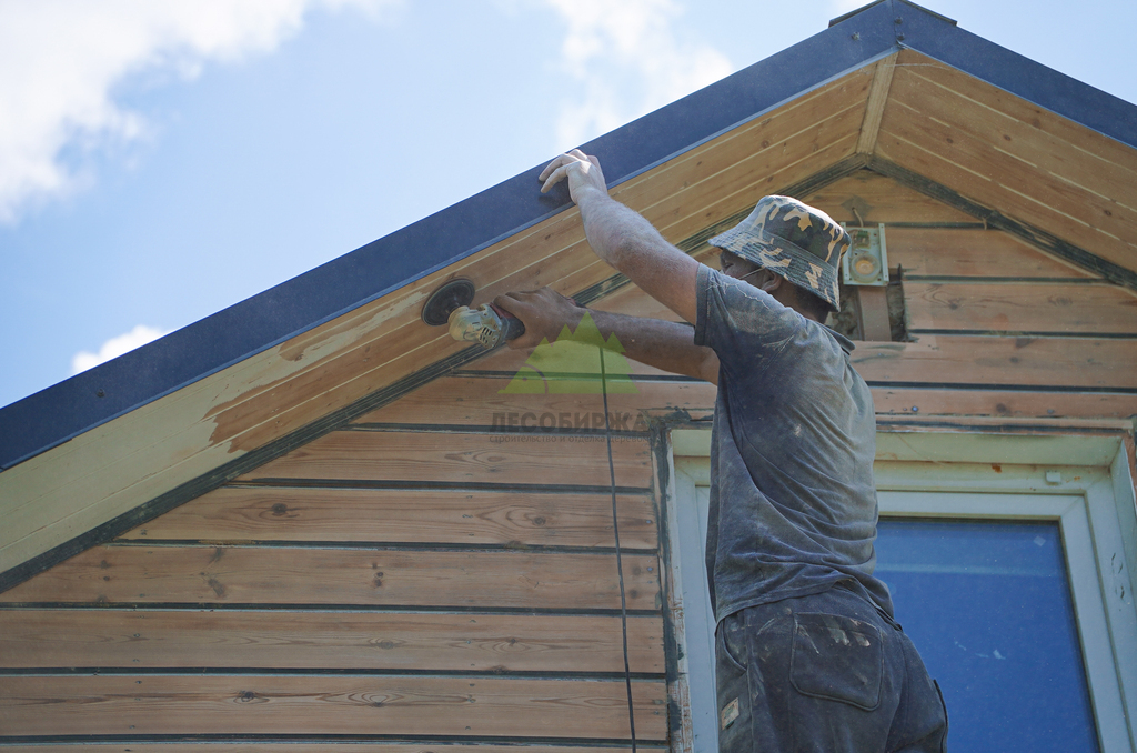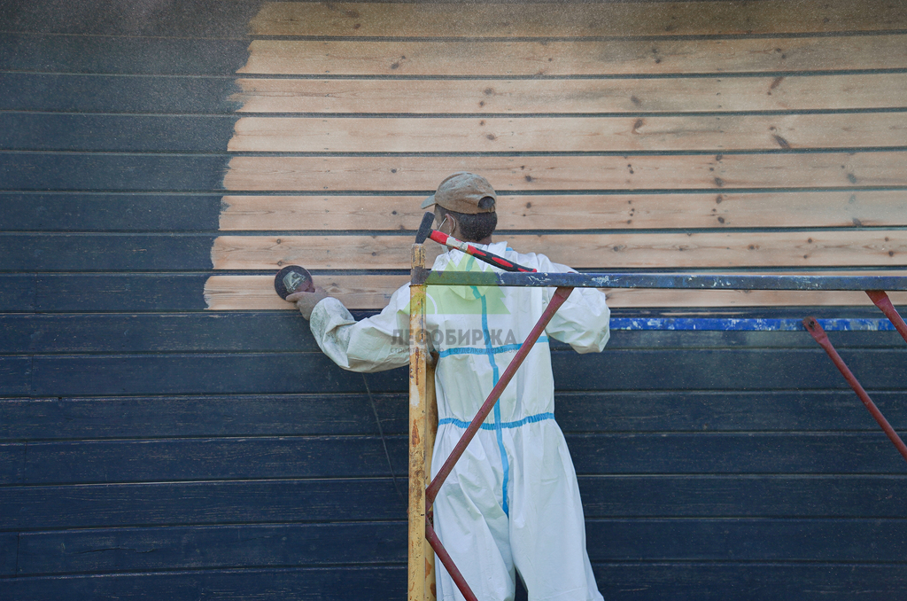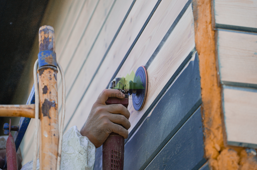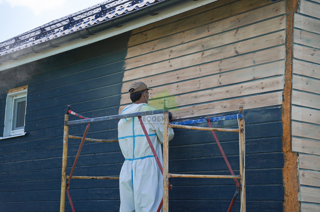 Адрес объекта: Можайский муниципальный округ, Московская область, дер. Кикино. Предыдущее укрывное покрытие, простоявшее лишь три года, локально потеряло адгезию и насыщенность. Мы сняли слабодержащиеся слои до прочного основания, выровняли геометрию «имитации бруса» и подготовили поверхность под профессиональную систему покрытия.