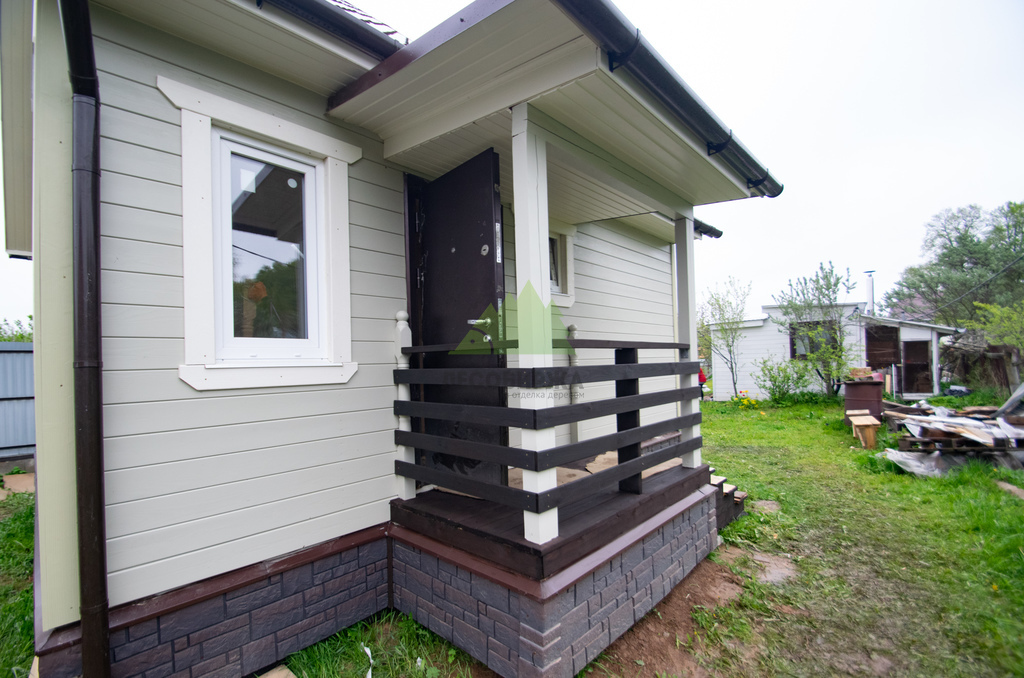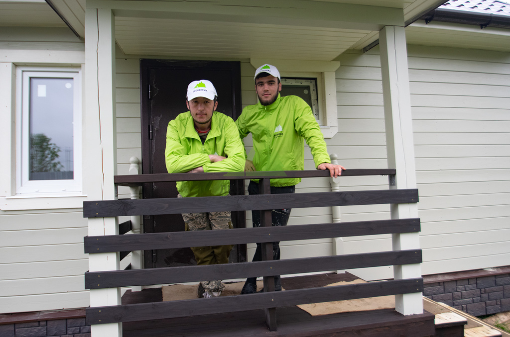 Помимо основной покраски, команда Лесобиржи-СПб также полностью обновила декоративные элементы. Старые наличники на окнах и накладки на углы, выполненные из недорогих материалов, были демонтированы. Вместо них наши мастера изготовили и установили новые элементы из сибирской лиственницы, известной своей прочностью и долговечностью. Эти изделия прошли тщательную обработку: были брашированы для придания выразительной текстуры и покрыты итальянским гидромаслом Renner. Этот состав не только обеспечивает надежную защиту древесины от влаги и ультрафиолета, но и подчеркивает естественную красоту лиственницы, создавая глубокий, насыщенный оттенок. Аналогичные работы были выполнены и с ограждением крыльца, которое также получило обновленный вид из лиственницы с брашированием и обработкой гидромаслом Renner. Такие детали придают дому завершенный, респектабельный вид и служат годами без нареканий.