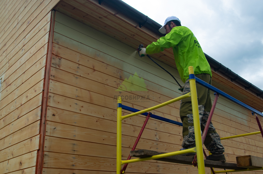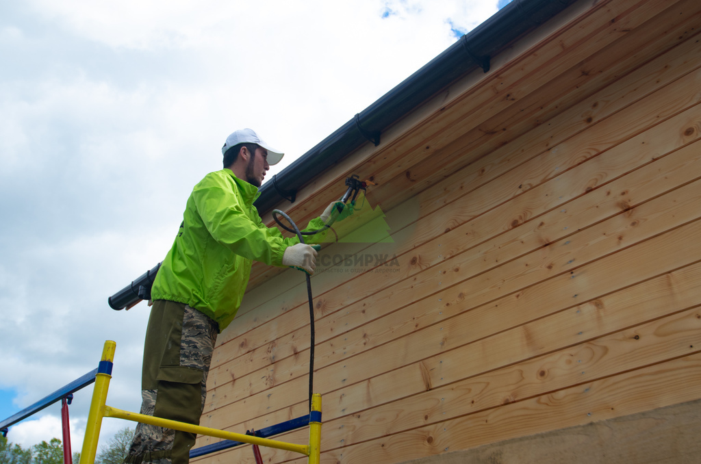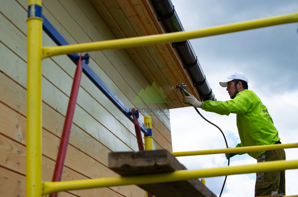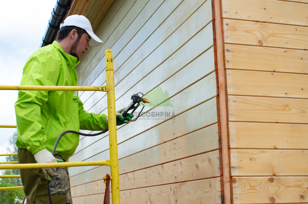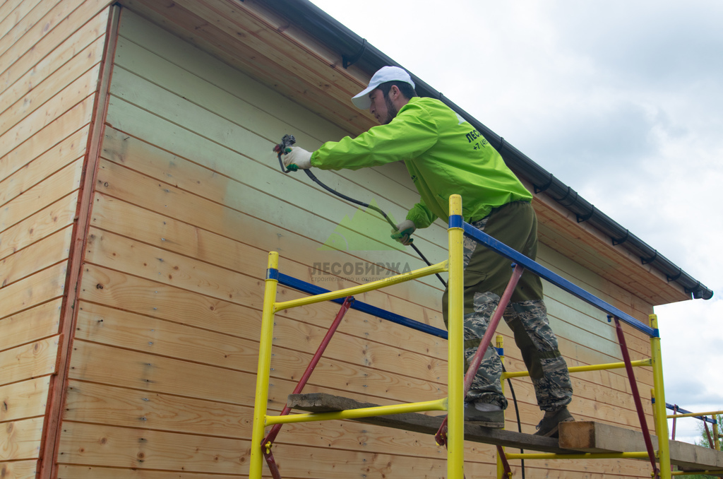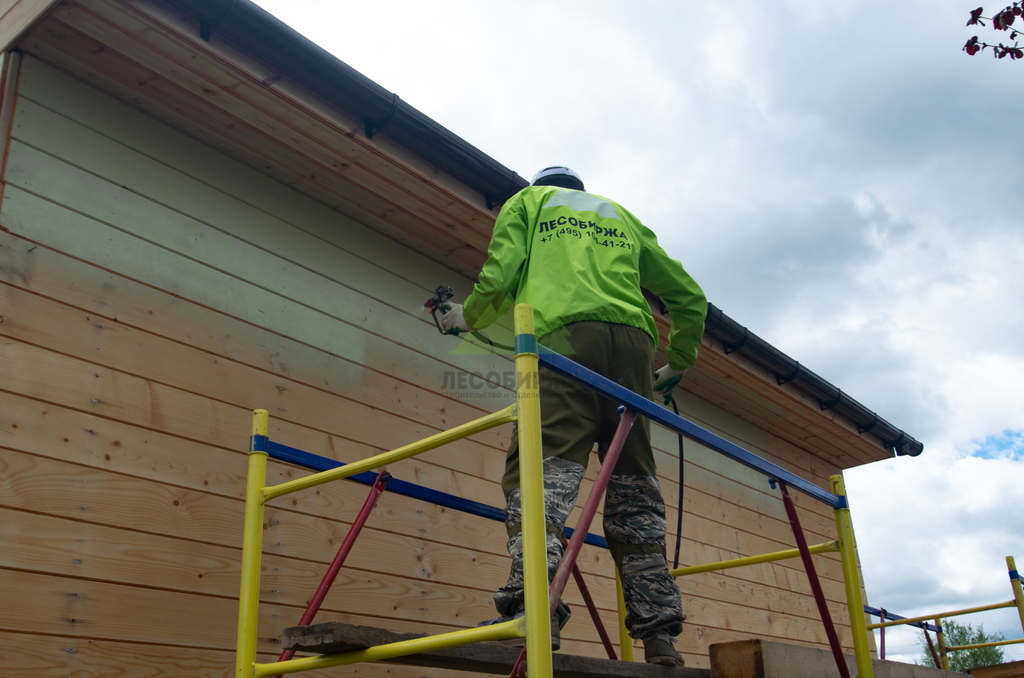 При нанесении краски мы применяли метод безвоздушного распыления с использованием профессионального оборудования Graco. Этот подход позволяет добиться идеально ровного и однородного слоя, без потеков и разводов, что практически невозможно при работе кистями или валиками, где для достижения схожего результата потребовалось бы минимум четыре слоя. Безвоздушное распыление существенно сокращает расход материала и время выполнения работ, обеспечивая при этом максимальное качество покрытия. После нанесения первого слоя, обязательным этапом стала промежуточная шлифовка. Эта процедура необходима для удаления поднявшегося ворса на имитации бруса, что обеспечивает идеально гладкую поверхность и лучшее сцепление для финишного слоя. Наши мастера всегда подчеркивают важность этого этапа: качественная шлифовка между слоями – залог долговечного, изящного и "играющего" на солнце покрытия. Это инвестиция времени, которая окупается годами безупречной эксплуатации.