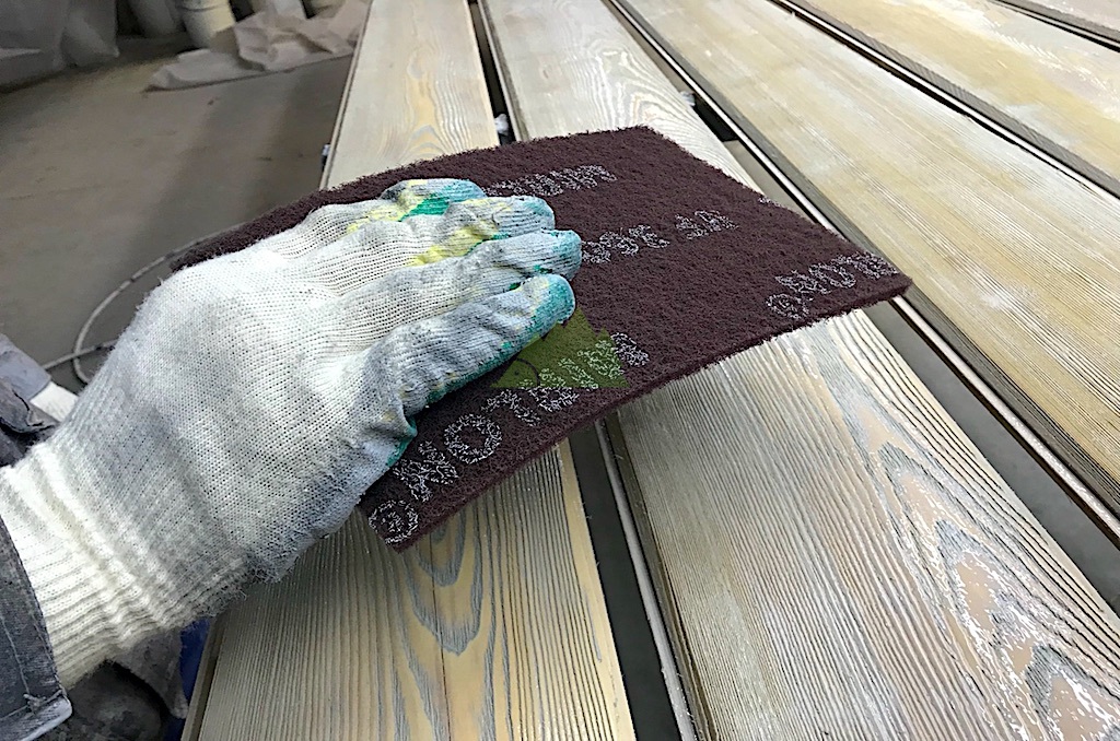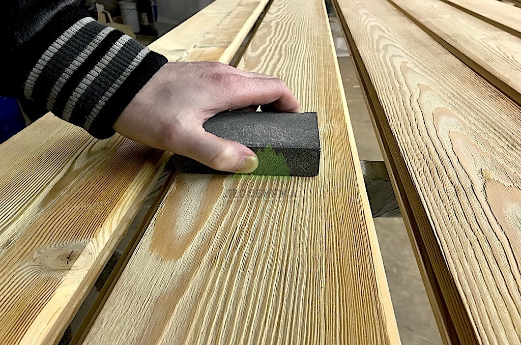 - Глубокая механическая брашировка: Первым и одним из самых важных шагов стало удаление мягких волокон древесины. Для этого наши мастера использовали ручной фрезер, оснащенный грубой латунной щеткой. Этот процесс требует особого мастерства и твердой руки, чтобы создать глубокий, но равномерный рельеф, не повредив при этом структуру более твердых слоев лиственницы. Именно на этом этапе формируется уникальный узор состаренной древесины, который так ценится в современном дизайне интерьеров, будь то лофт, прованс или скандинавский стиль.