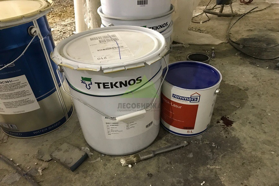 4. Нанесение первого слоя лака на лицевую сторону (161,2 м2): После высыхания грунта был нанесен первый слой финишного лака Teknos. Этот слой начал формирование защитной пленки и придал древесине желаемый оттенок.