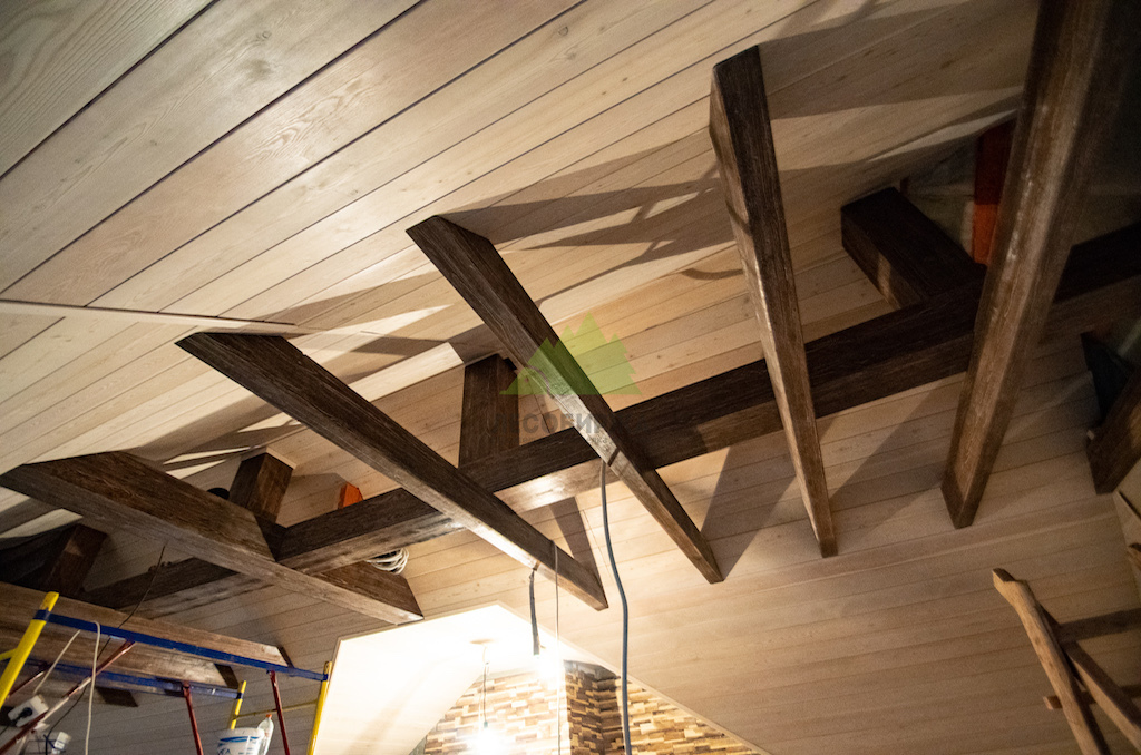 Особое внимание в проекте уделялось созданию и монтажу декоративных фальшбалок. Эти элементы выполняли не только эстетическую функцию, придавая интерьеру характерный шарм рустикального или скандинавского стиля, но и практическую – скрывали старые, неприглядные силовые конструкции, трансформируя их в изысканные дизайнерские акценты. Фальшбалки были изготовлены из тщательно отобранной древесины и подверглись сложной, многоступенчатой обработке методом патинирования, что придало им уникальный винтажный вид с эффектом благородного старения. Процесс патинирования, выполненный нашими мастерами, включал следующие этапы: