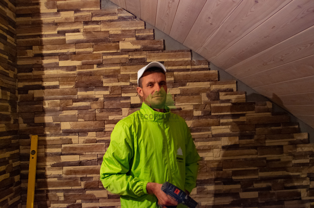 Особой изюминкой интерьера стало виртуозное сочетание деревянной отделки с элементами клинкерной плитки. Заказчик изначально стремился к нестандартным решениям, и наши специалисты с удовольствием поддержали эту идею. Цвет патинированных фальшбалок был тщательно подобран под оттенки клинкерной плитки, создавая единую, гармоничную палитру. Эта комбинация текстур – теплого, фактурного дерева и благородного, слегка шероховатого клинкера – придает помещению неповторимый характер, сочетающий в себе уют загородного дома и современную эстетику. Как вы можете убедиться на представленных фотографиях, визуальный эффект превосходит все ожидания: фальшбалки не просто украшают потолок, они становятся неотъемлемой частью архитектурного ансамбля, идеально вписываясь в общую картину и визуально расширяя пространство.